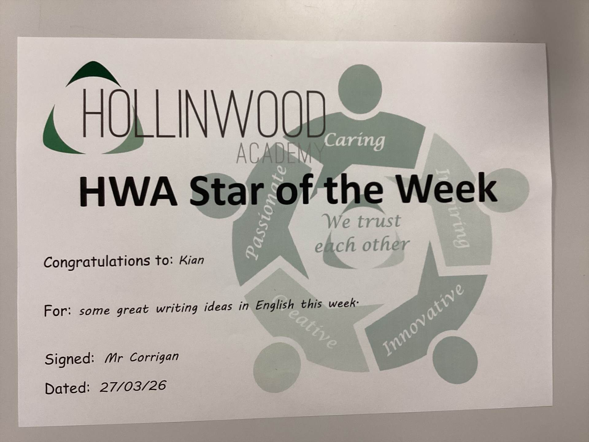Mr Corrigan’s STAR of the Week is Kian for some great writing ideas in English this week.