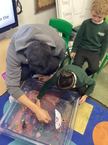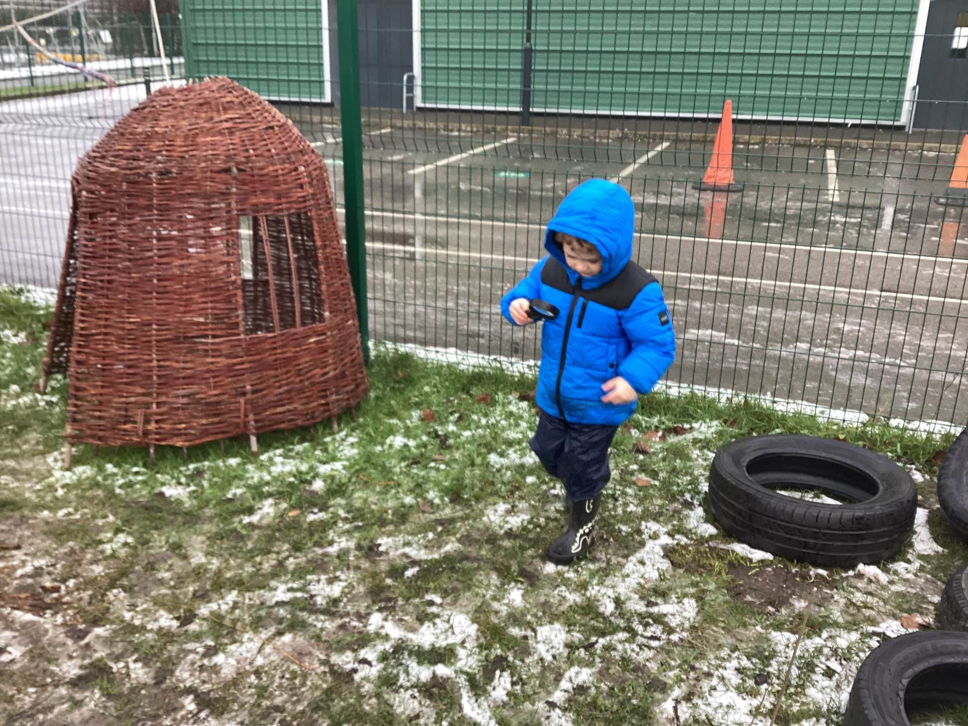 In Forest School this week we really enjoyed a snowy session! We explored signs of Winter that we would see and joined in with a poem all about Winter. The children loved making footprint and crunching the snow underneath their wellies. In the mud kitchen we made snowcakes and decorated them with food colouring. To end the session we enjoyed a warm hot chocolate and a gingerbread man biscuit whilst sat around our basecamp singing “Ram Sam Sam”."