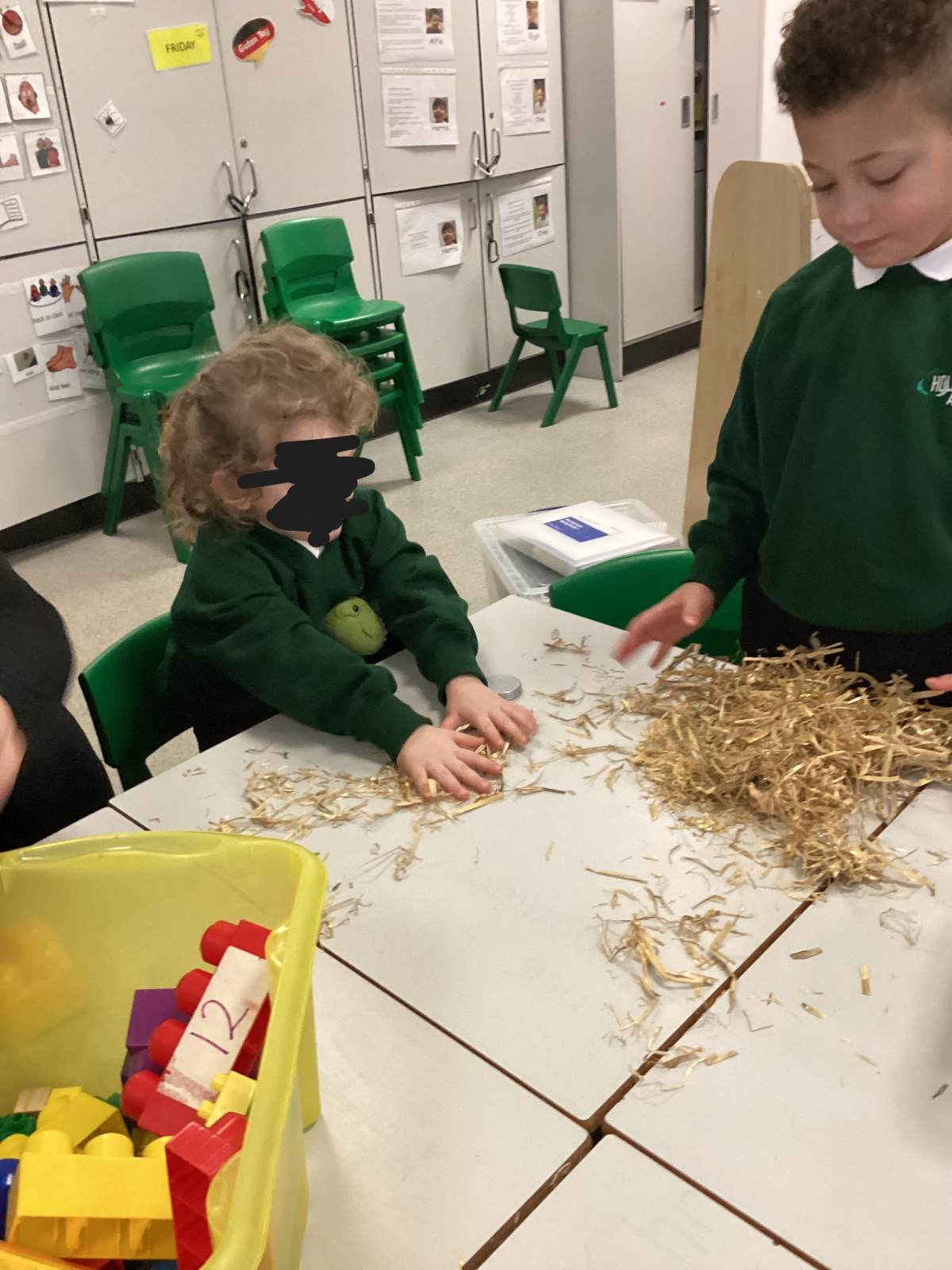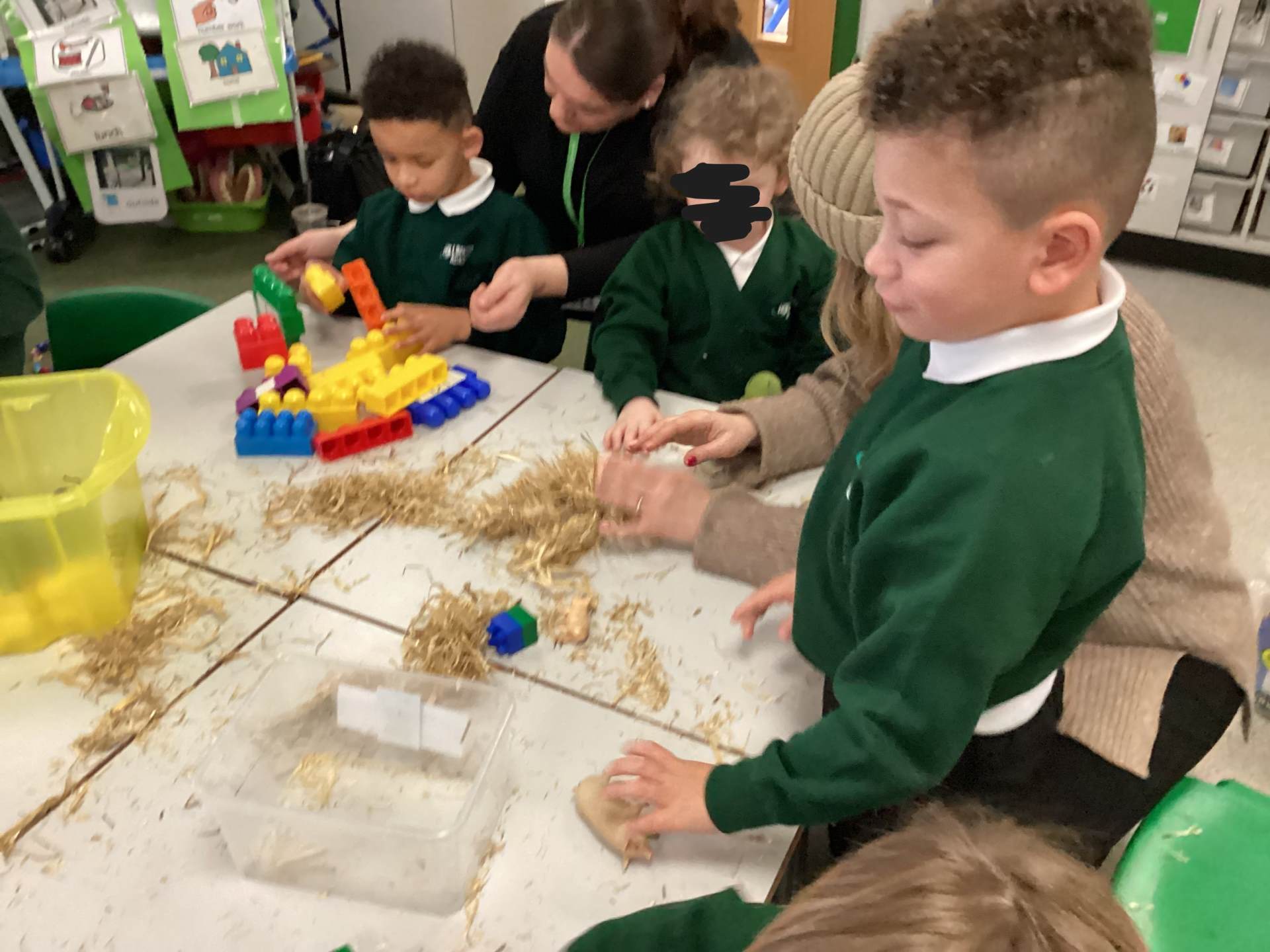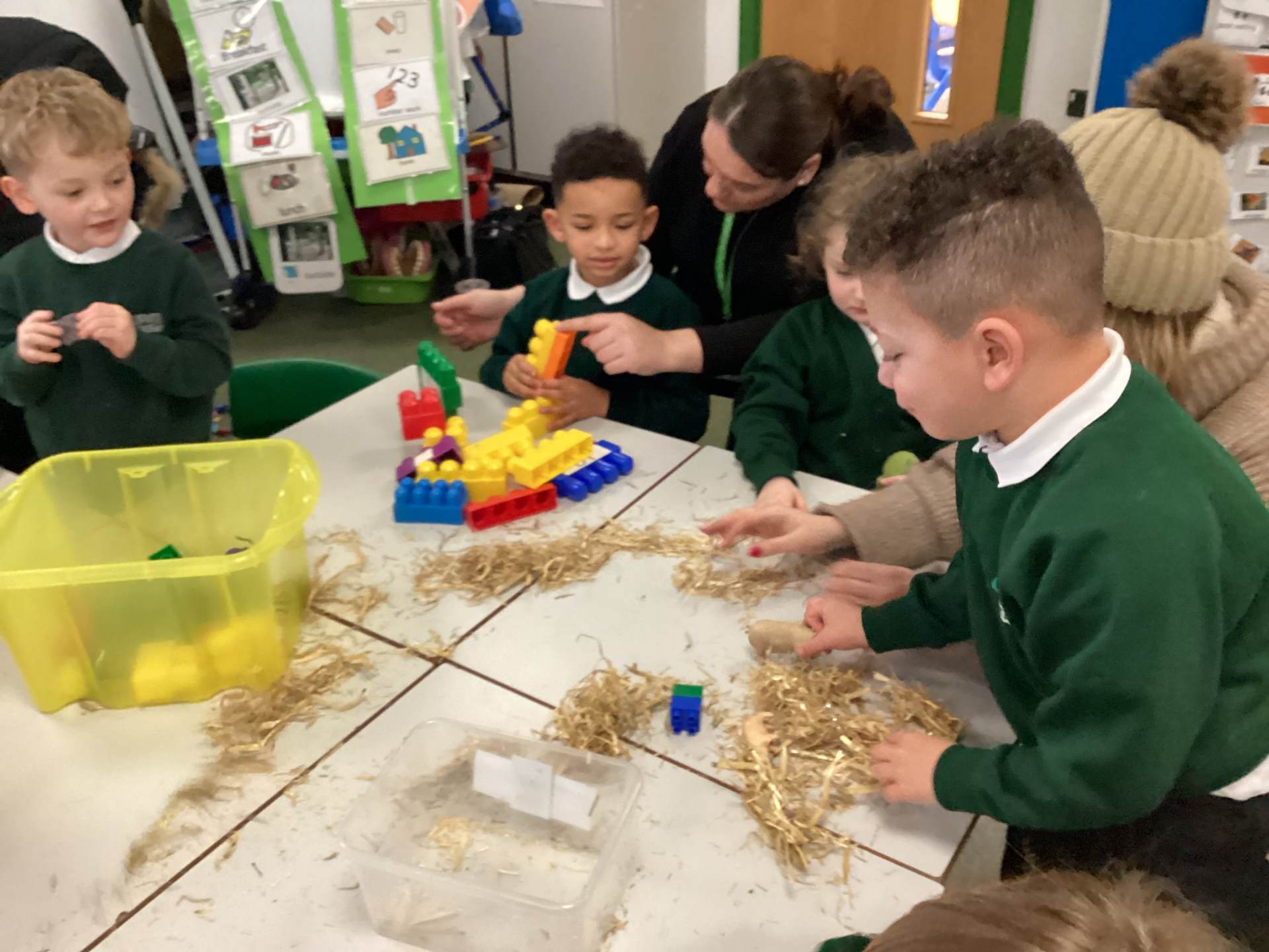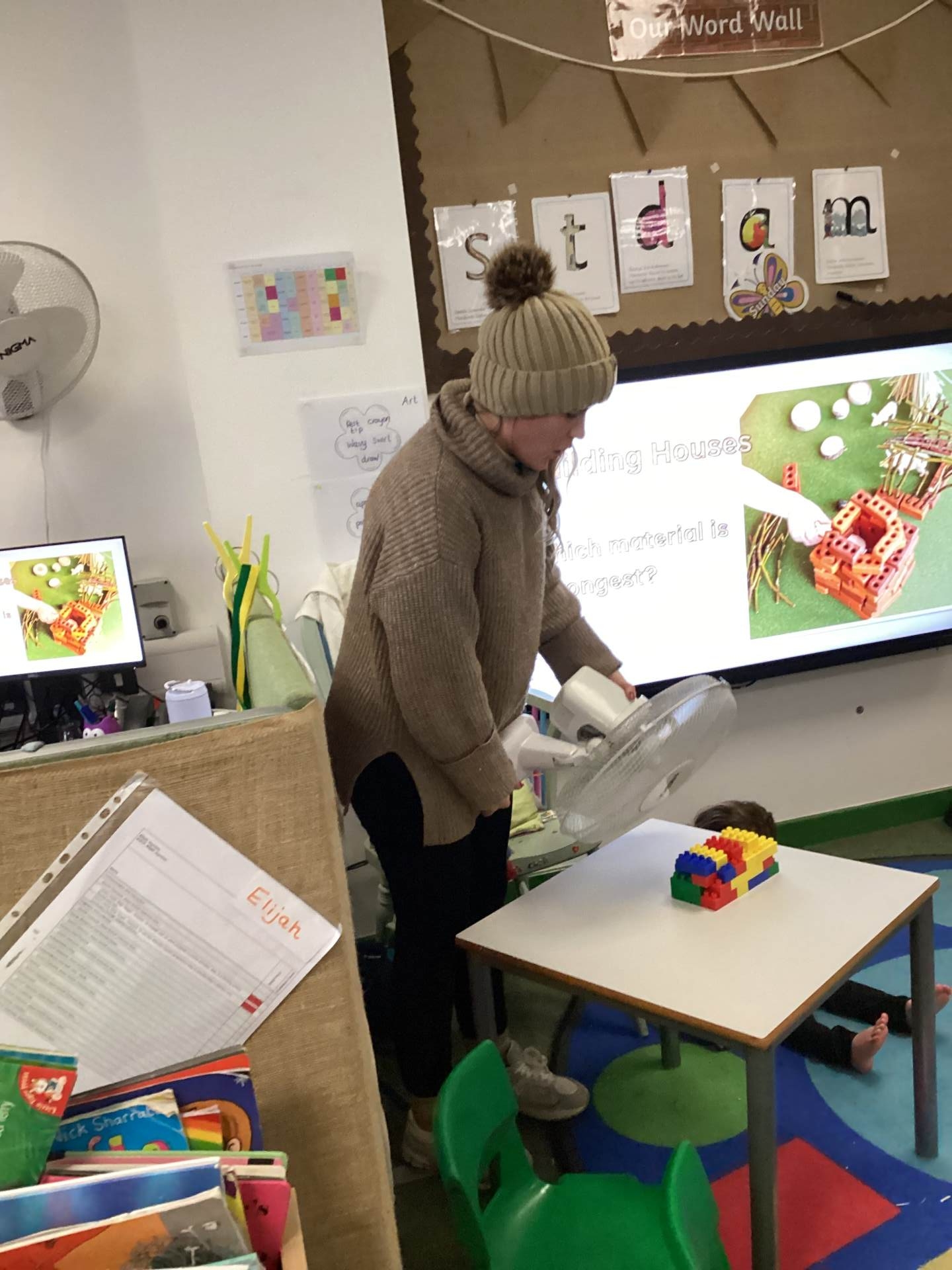 In Science this week we have been investigating what material is strong and what is week, using our Three Little Pigs story as inspiration! First Miss Callan built a house of straw, sticks and bricks, then we used a fan to blow the house (just like the big bad wolf) using our repeated refrains from the story. We enjoying finding out which materials were weak and fell down and which were strong and stayed up. The children then enjoyed making their own houses, choosing which materials to use. We all became wolves, blowing down our houses to find out if they were strong or weak!