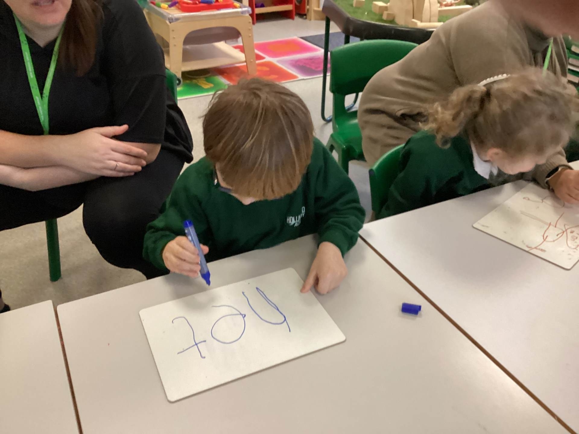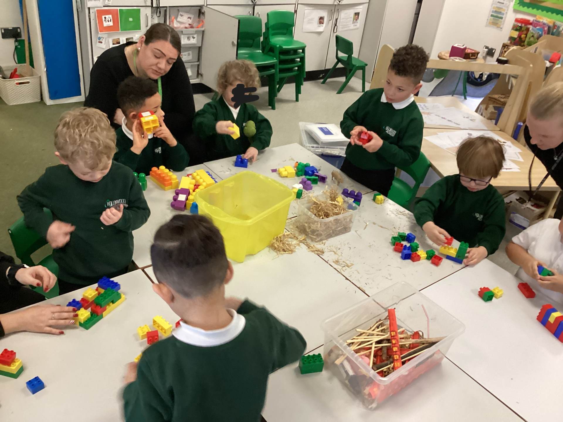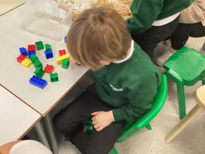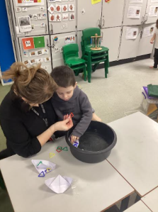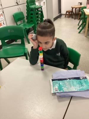 In maths we have been learning about capacity. We looked at heaviest and lightest. We then read a story called Mr Gumpty’s Outing, the book is all about a man who goes out on his boat and lots of animals’ pile on to the boat. The boat begins to tip, and all the animals fall into the water. We then made our own paper boats and coloured them. We then went into small groups to re-enact the story. We have also been looking at the numbers 6, 7, and 8. We have practiced writing them and counting up to them. We have been building towers, by counting out the right number of cubes and shouting “STOP” when we reach the right number, to help us learn to count out objects from a larger group. We have also been painting the numbers and stamping 6, 7, and 8 times- remembering to stop too.