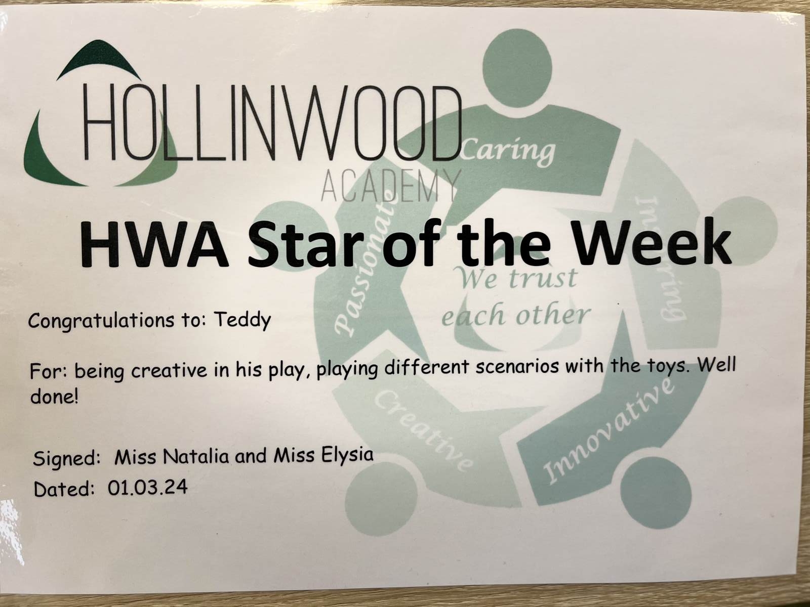 Miss Pietraszewska’s HWA Creative STAR is Teddy for being creative in his play, playing different scenarios with the toys. Well done!