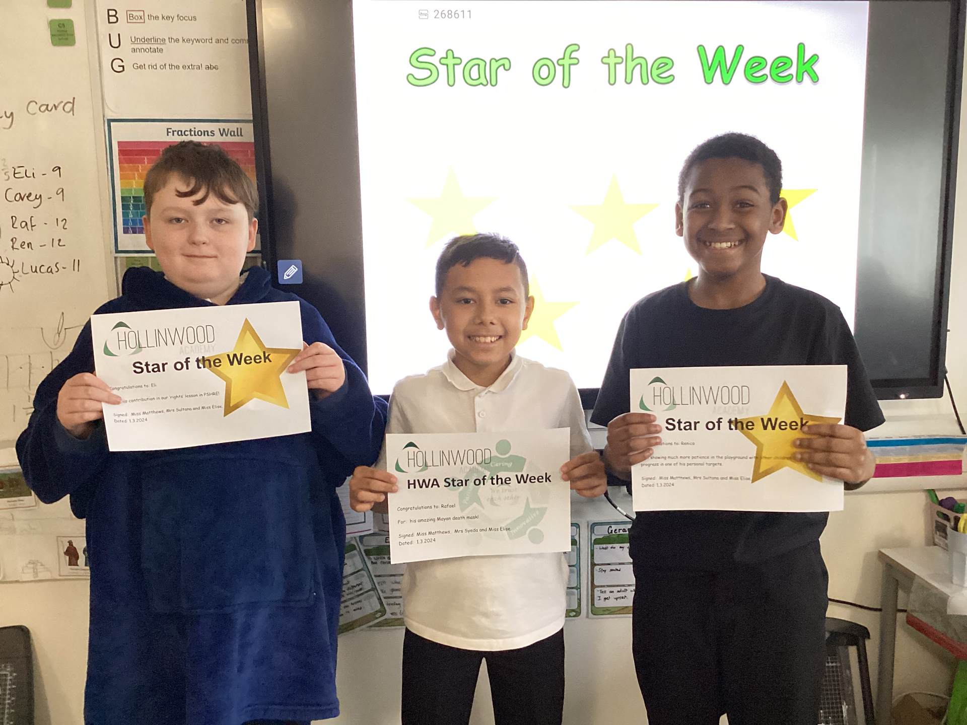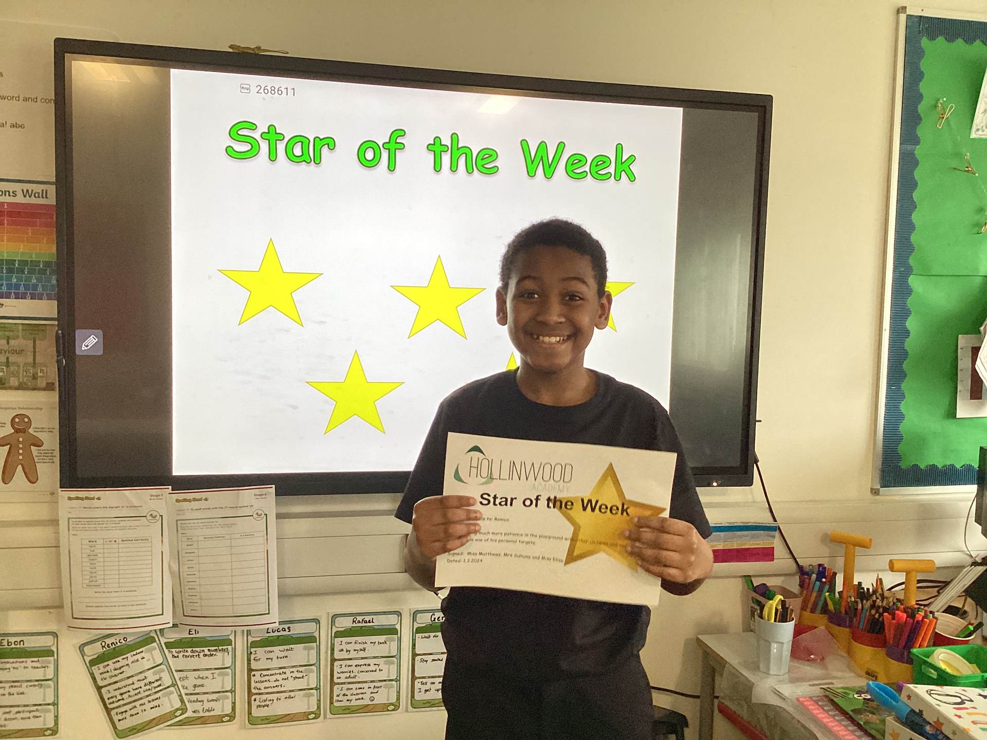 Miss Matthew’s STARs of the week are Renico for showing much more patience in the playground with other children and making progress in one of his personal targets and Eli for his contribution in our ‘rights’ lesson in PSHRE!