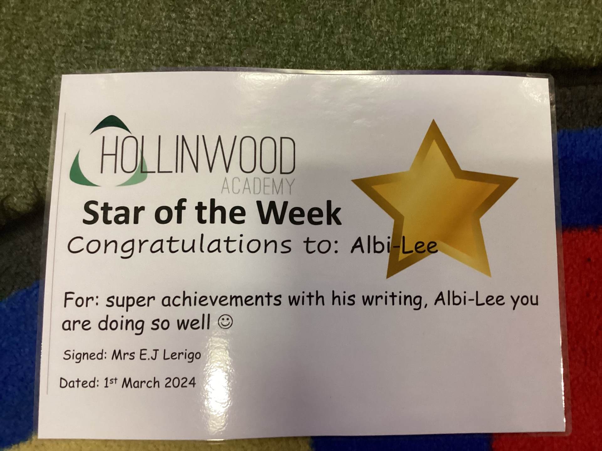 Mrs Lerigo’s STAR of the week is Albi-Lee for super achievements with his writing, Albi-Lee you are doing so well.