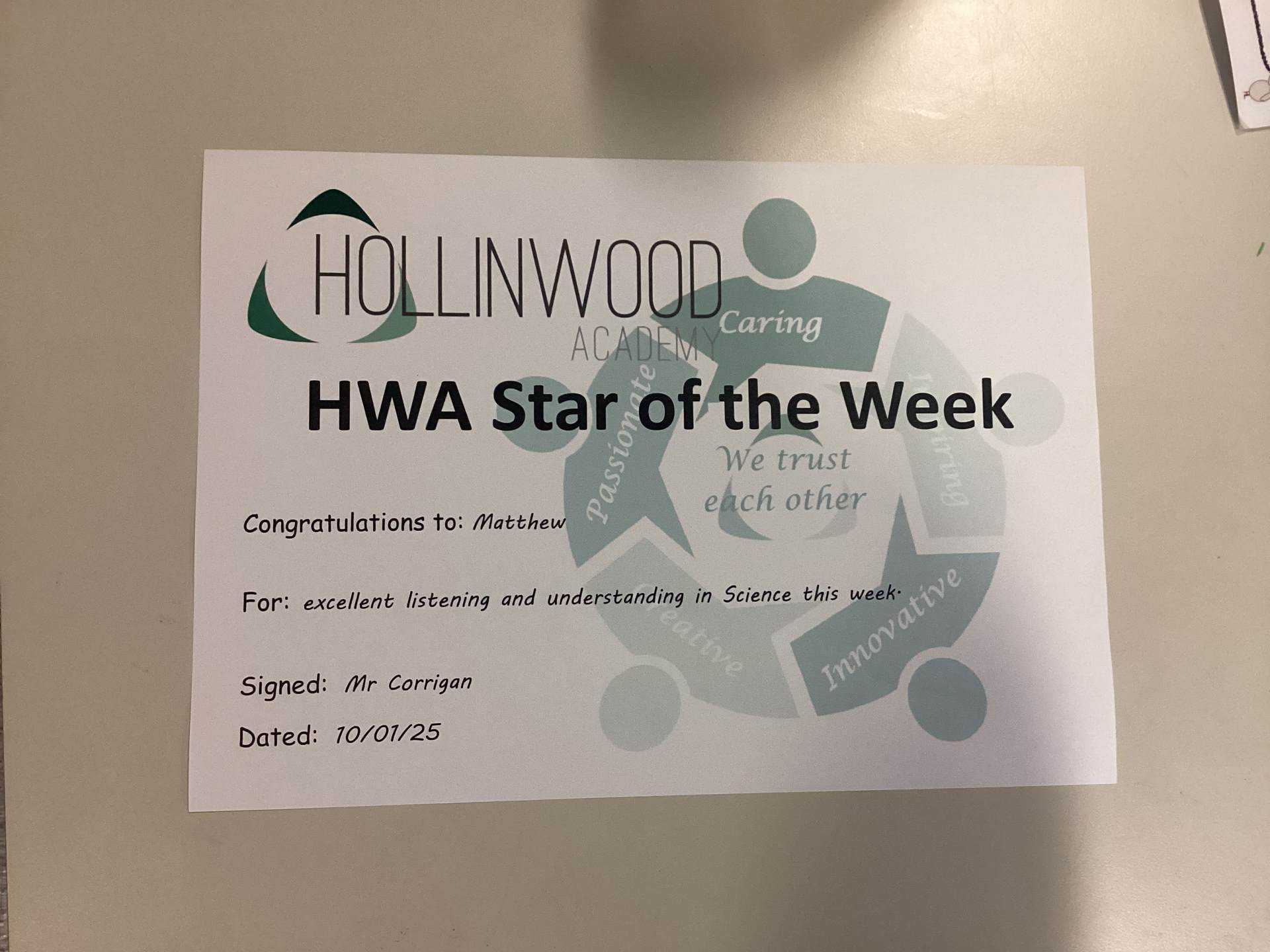 Mr Corrigan’s HWA We are Innovative star is Matthew for excellent listening and understanding in Science this week.