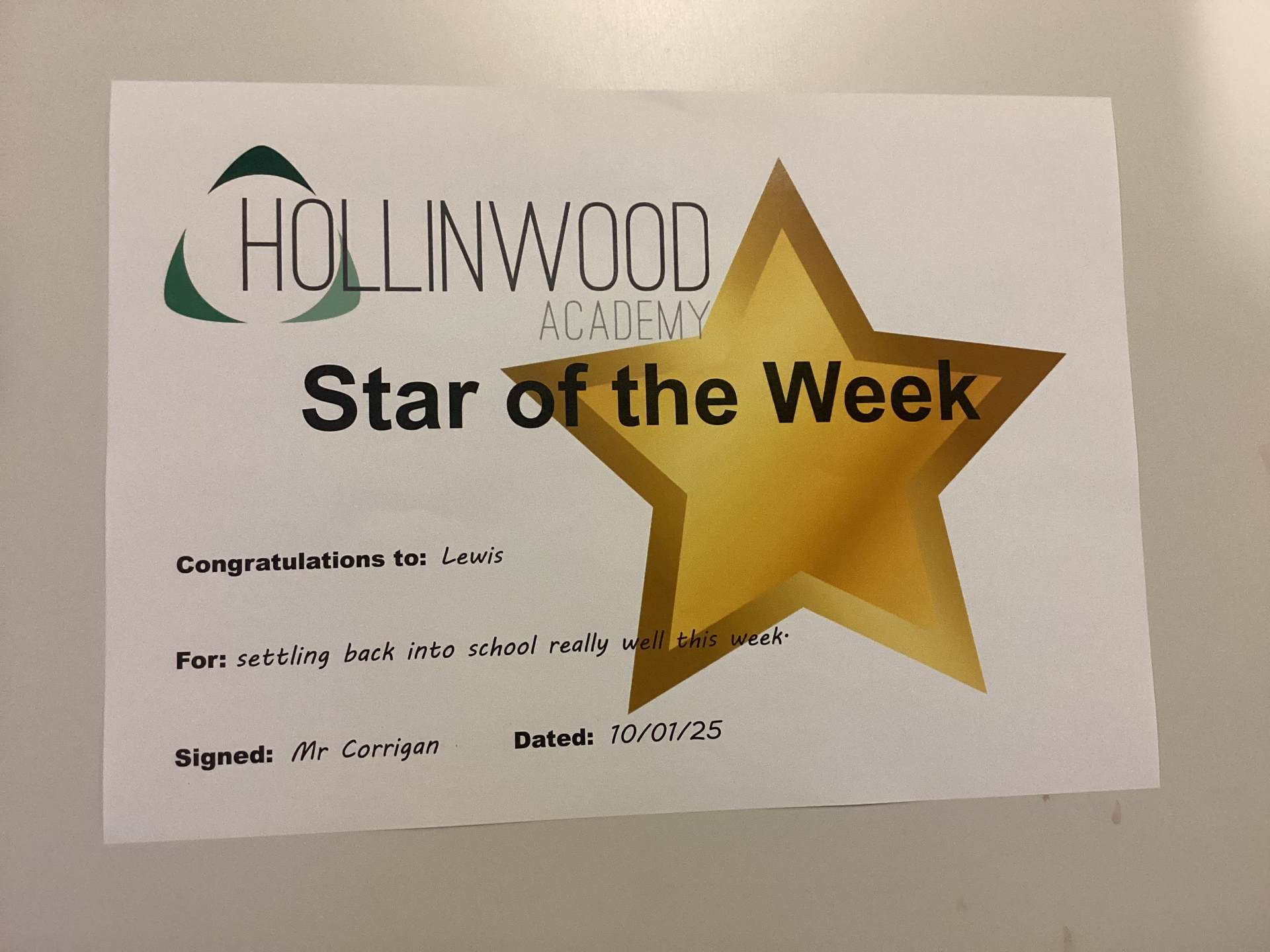 Mr Corrigan’s STAR of the week is Lewis for settling back into school really well this week.