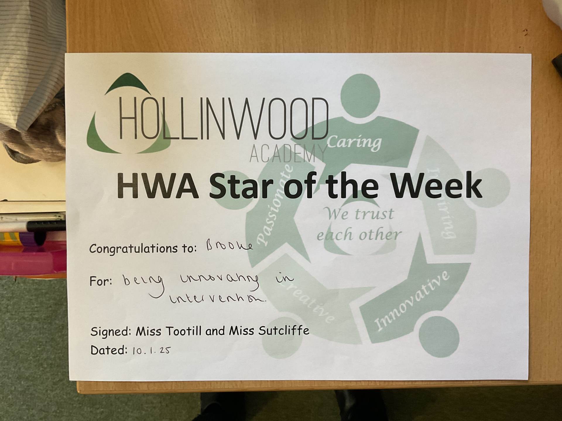 Miss Tootill’s STAR of the week is Brooke for being innovative in her intervention lesson.