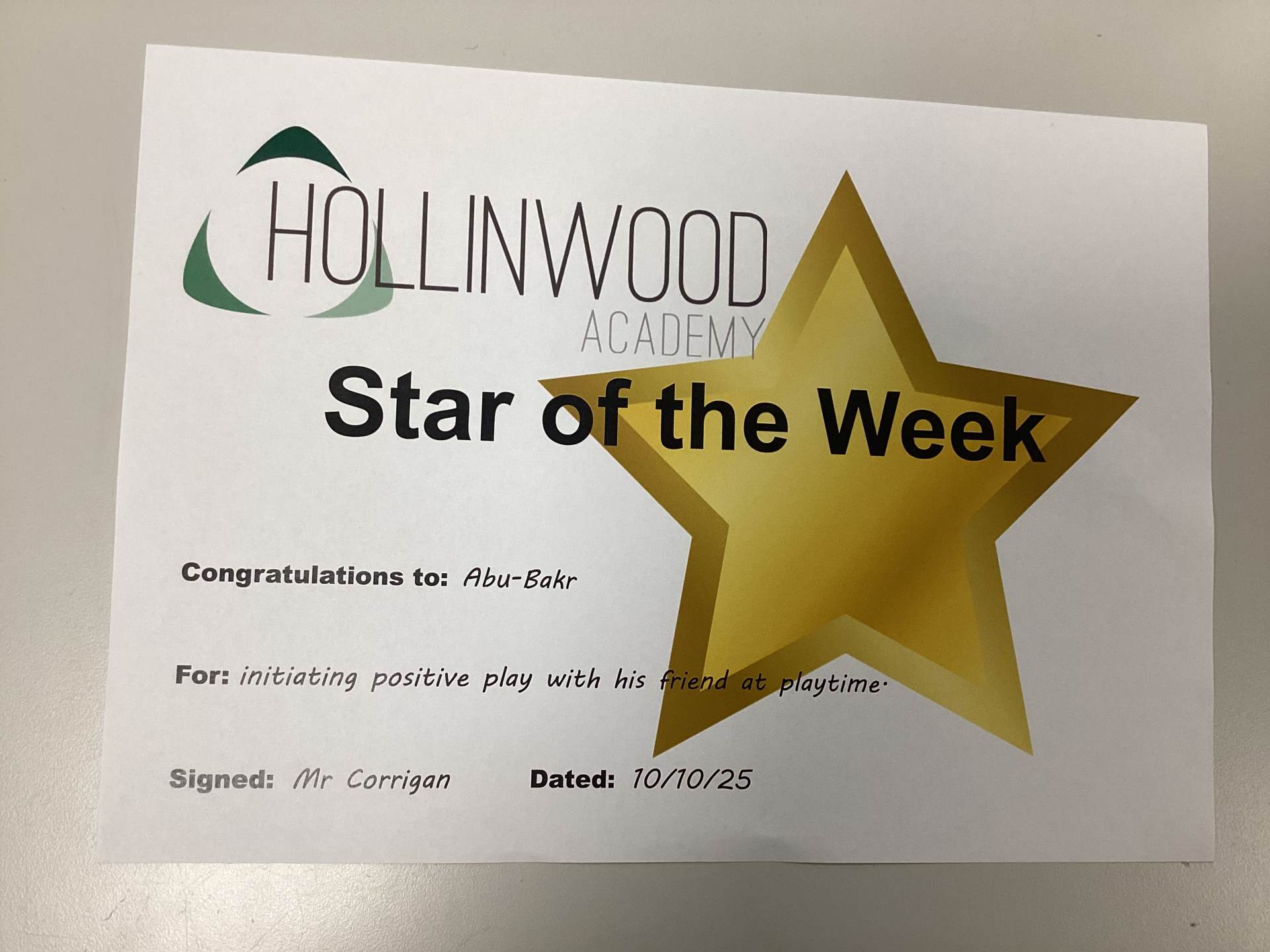 Mr Corrigan’s STAR of the Week is Abu-Bakr for initiating positive play with his friend at playtime.
