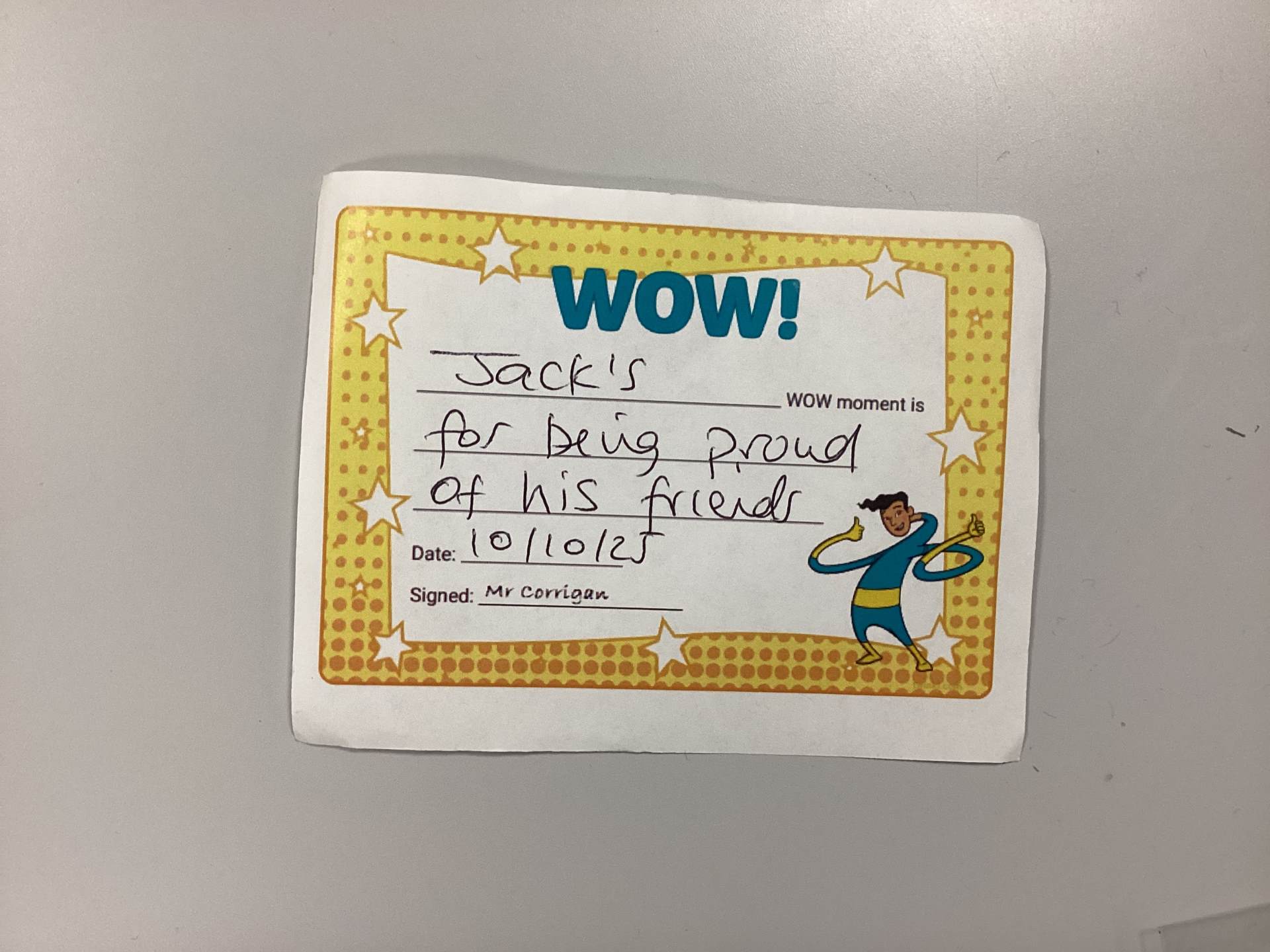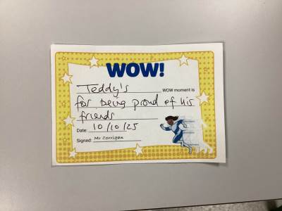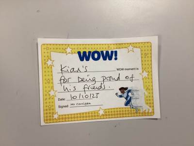 Mr Corrigan’s WOW moments go to Kian, Teddy B & Jack for being proud of their friends.