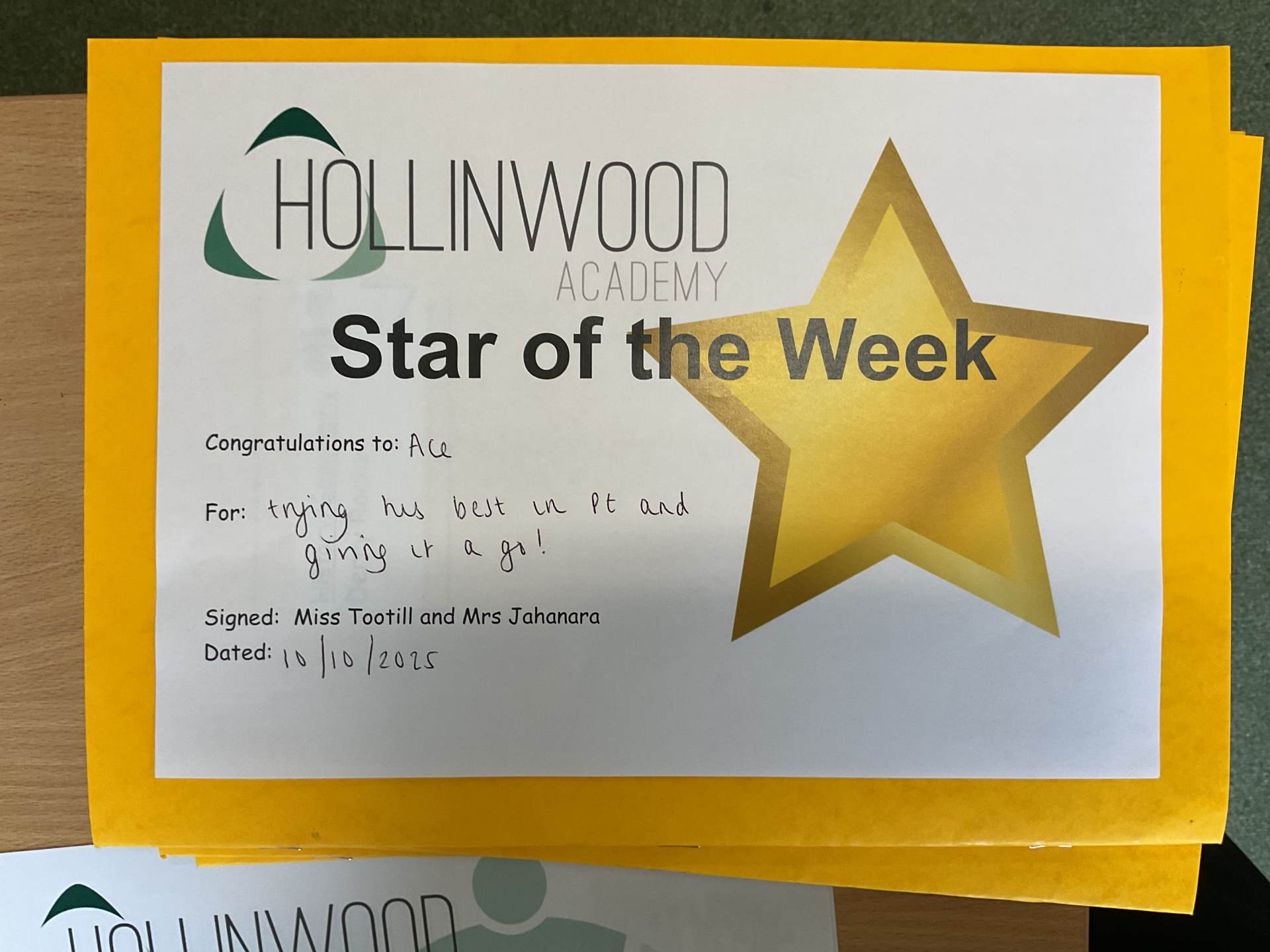 Miss Tootill’s STAR of the Week goes to Ace for trying his best in PE and giving it a go.