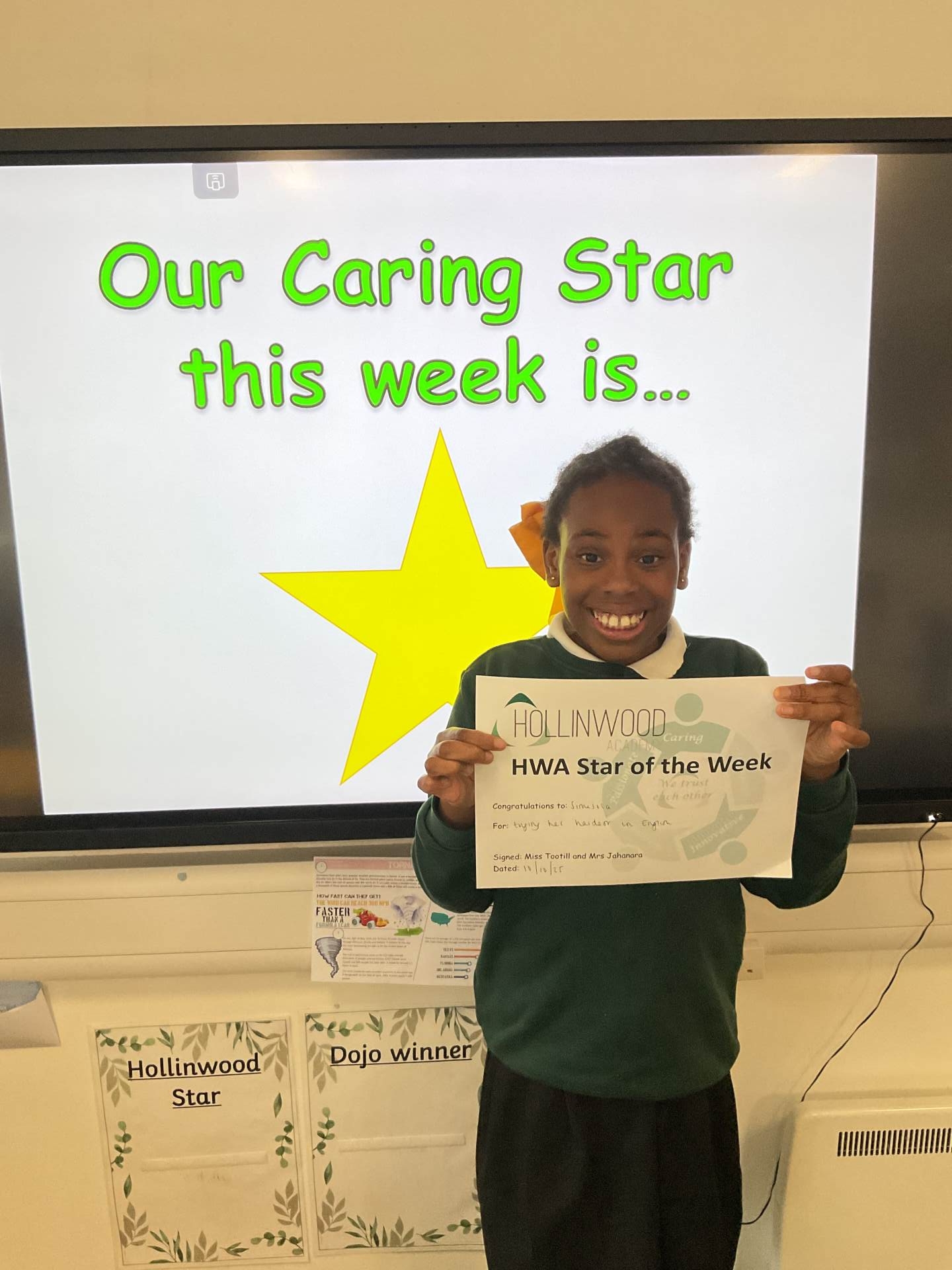 Miss Tootill’s HWA We are Caring goes to Simisola for trying her hardest in English.
