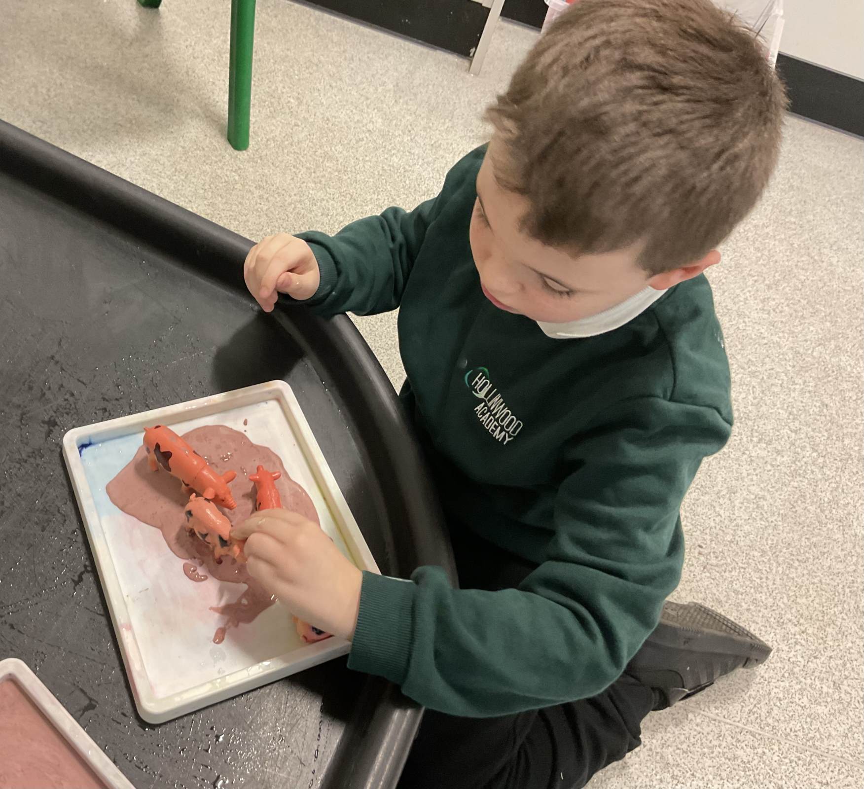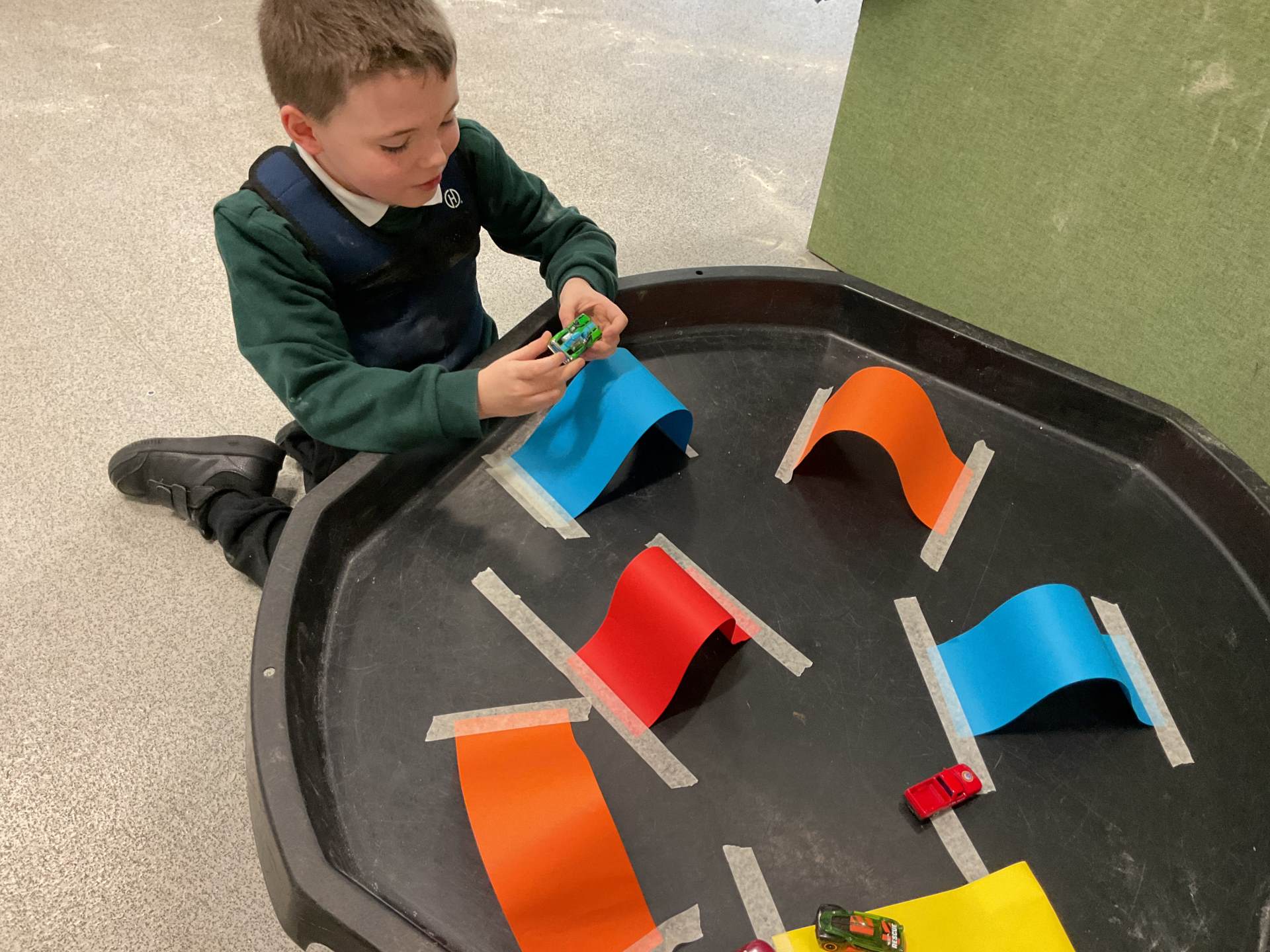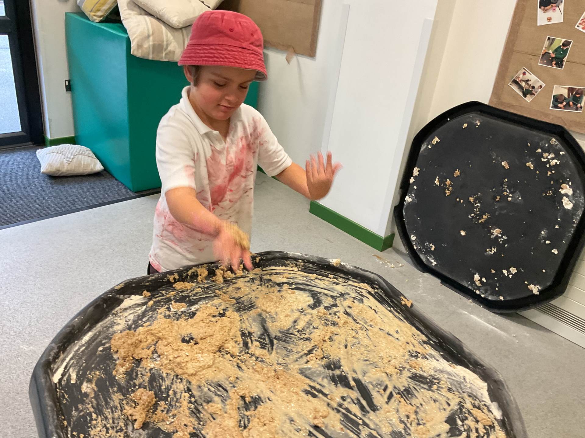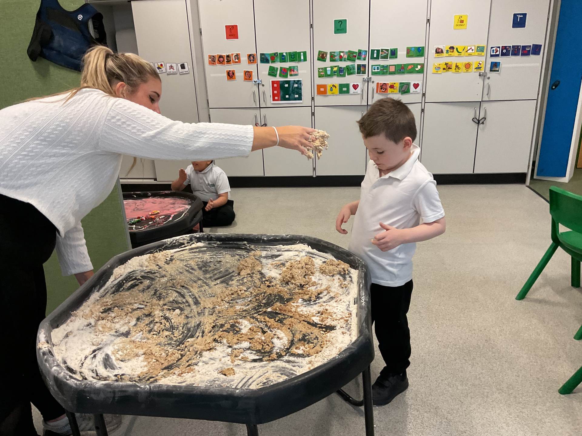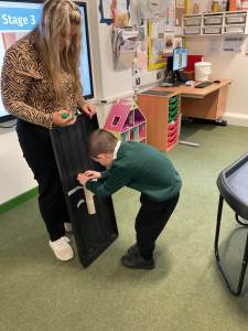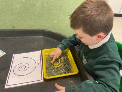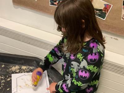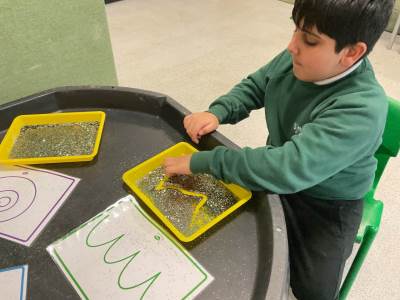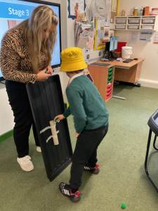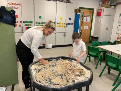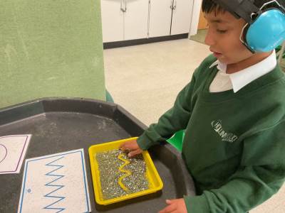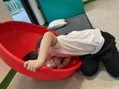 In communication we have been exploring the words big and small, hot and cold, fast and slow and over and under linked to our traditional tales each week. This week we are learning about ‘in and out’. The children have participated in attention autism sessions to deliver this vocabulary. During the last stage of attention autism, the children have been having a go at tuff tray tasks with the support of adults as required. These tasks have included using their musical and physical skills.