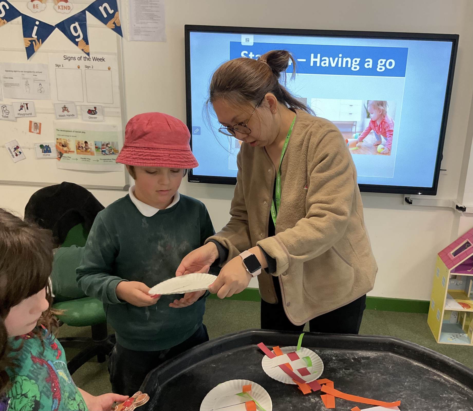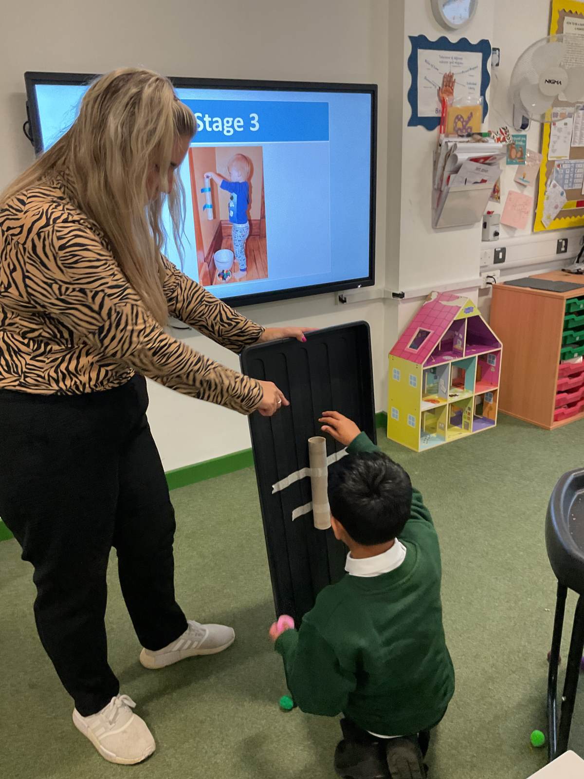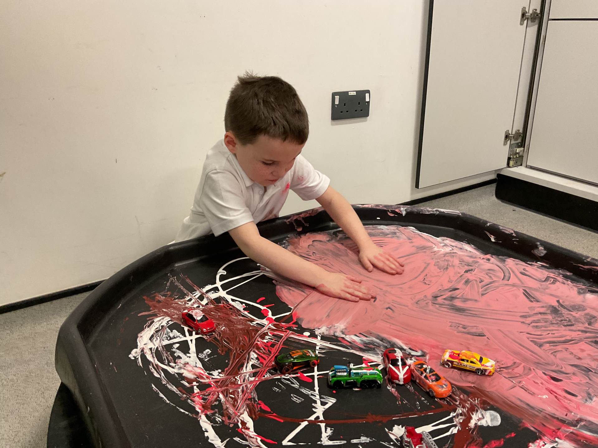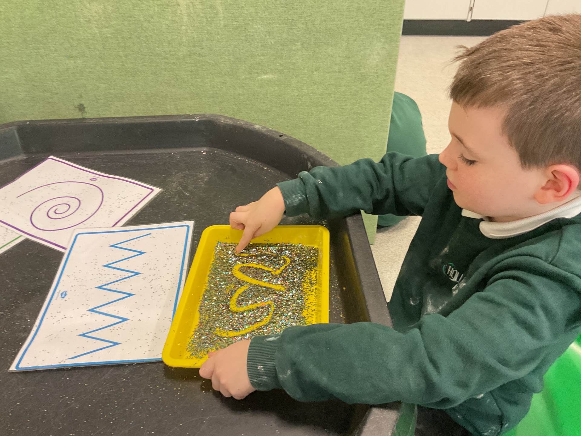 In communication we have been exploring the words big and small, hot and cold, fast and slow and over and under linked to our traditional tales each week. This week we are learning about ‘in and out’. The children have participated in attention autism sessions to deliver this vocabulary. During the last stage of attention autism, the children have been having a go at tuff tray tasks with the support of adults as required. These tasks have included using their musical and physical skills.