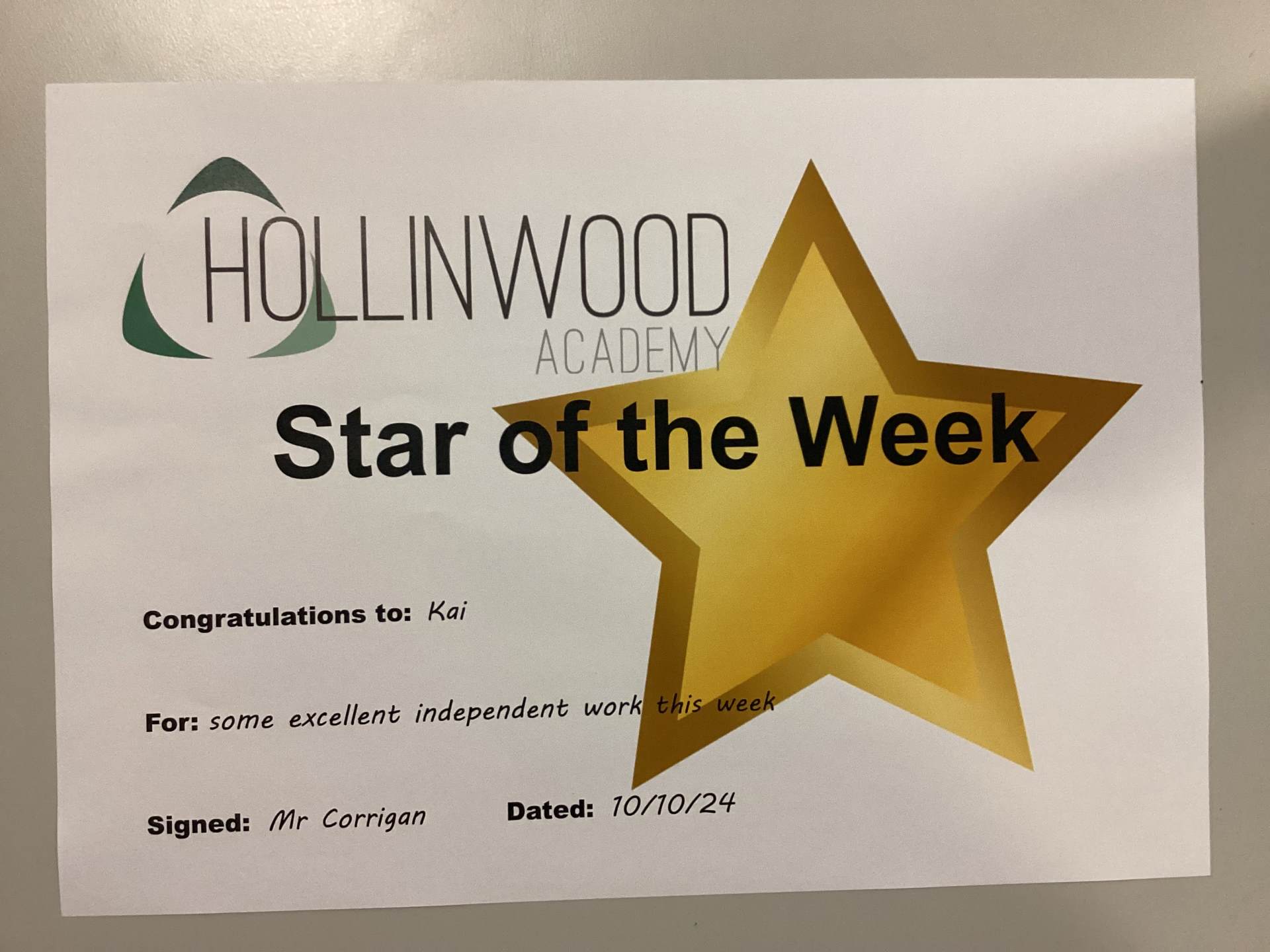 Mr Corrigan’s STAR of the week is Kai for excellent independent work this week