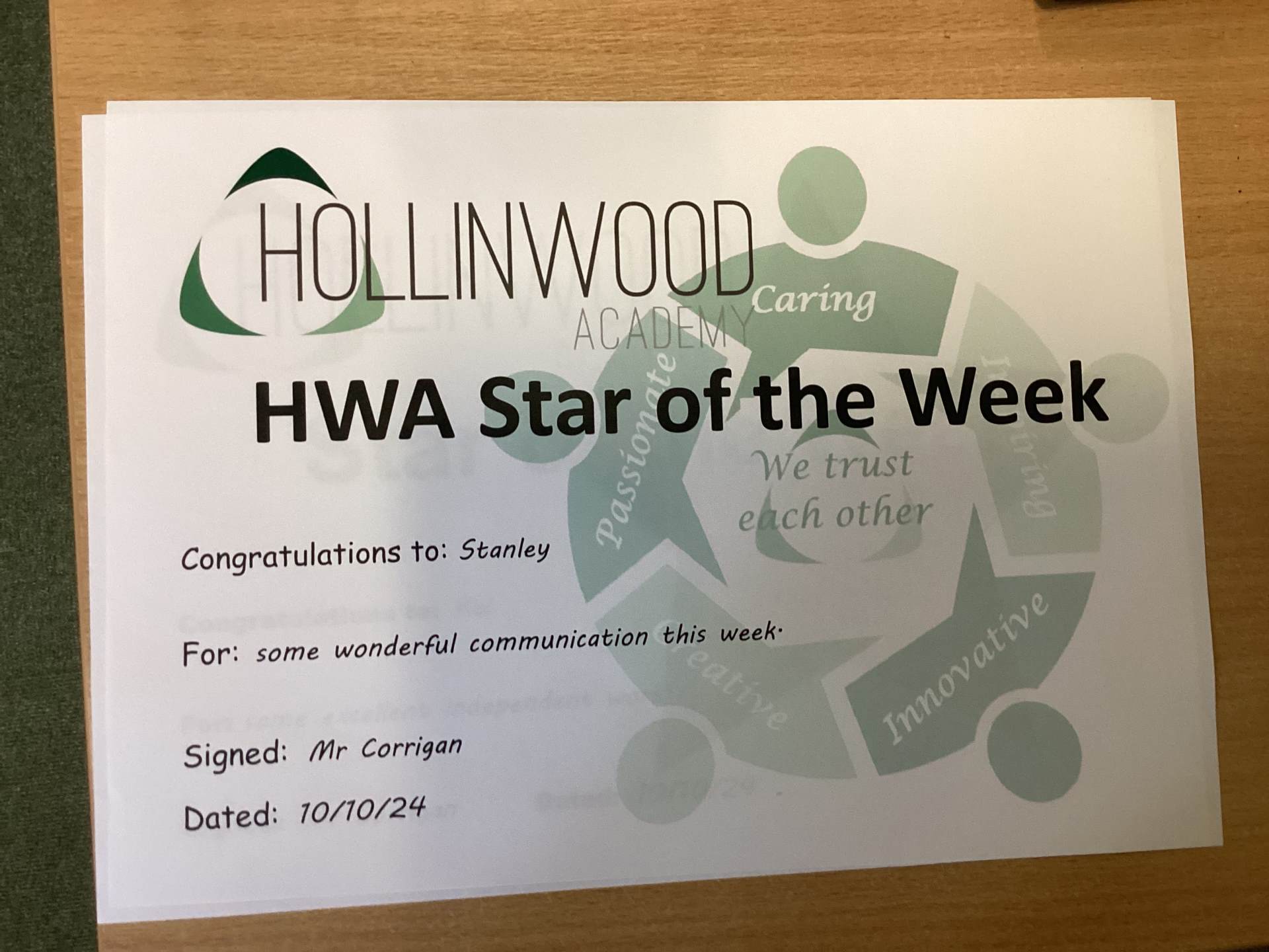 Mr Corrigan’s HWA We are Caring star is Stanley for wonderful communication this week