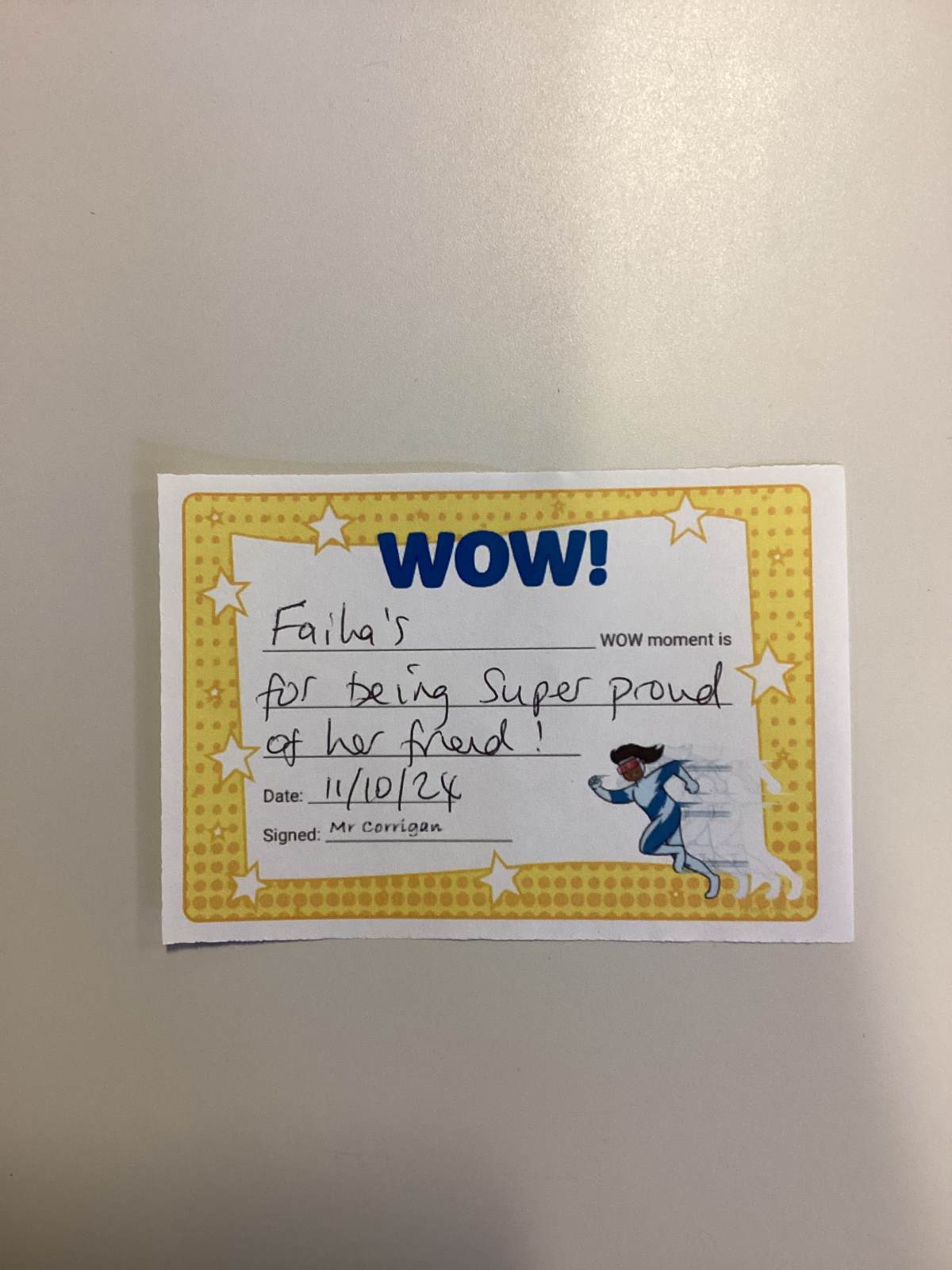 Mr Corrigan’s WOW moments go to Faiha for being proud of her friends