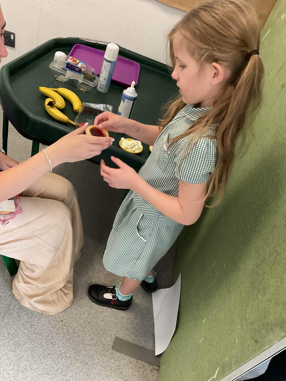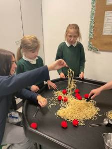 Our sensory story this week was Don’t Put Your Finger in the Jelly, Nelly! —which was an absolute favourite. The children were delighted to dive into all the foods from the story: squelching jelly, swirling spaghetti, and topping fruit pies with whipped cream. Things got very messy—and even more fun!