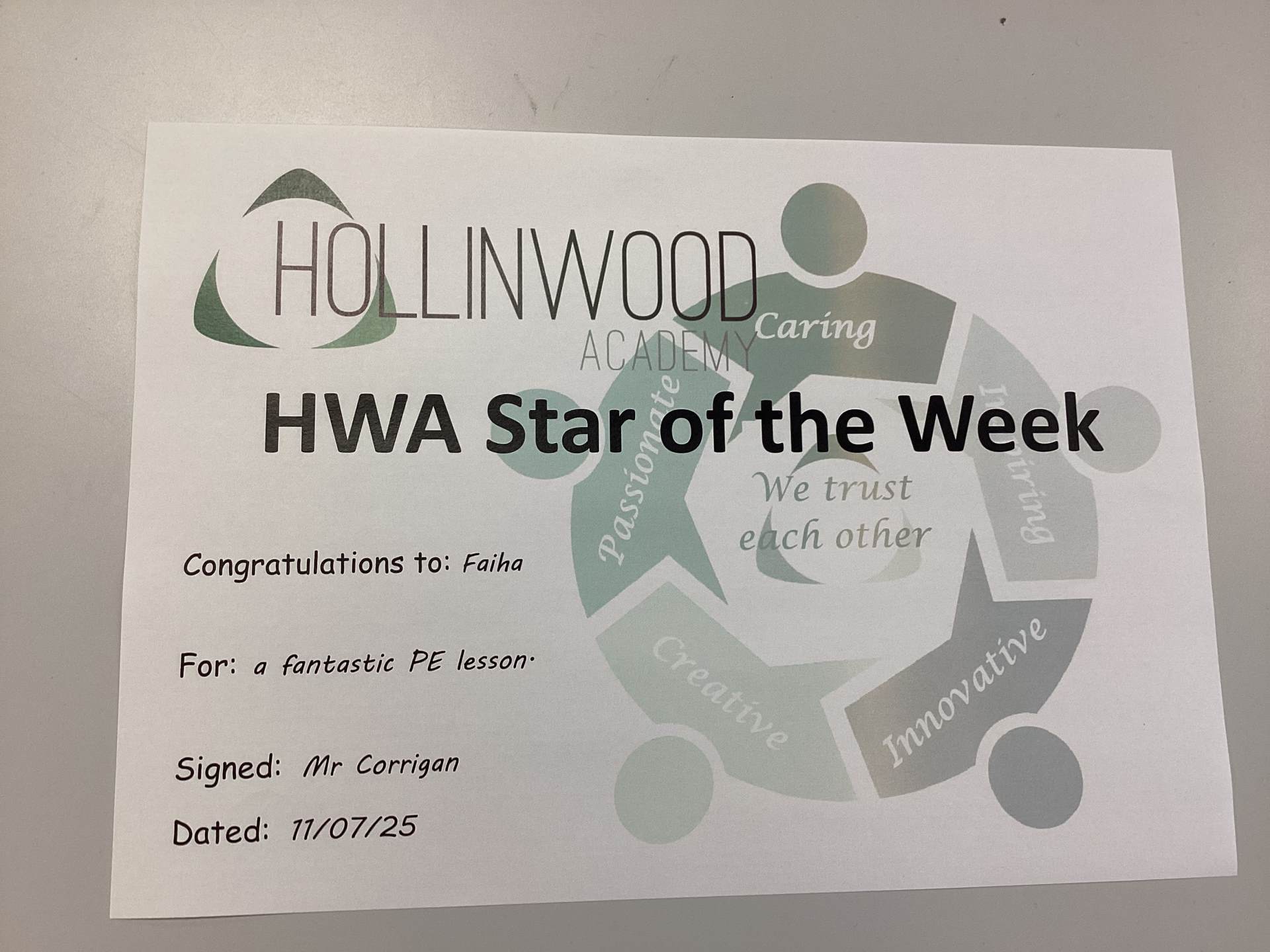 Mr Corrigan’s HWA We are trusting goes to Faiha for a fantastic PE lesson.