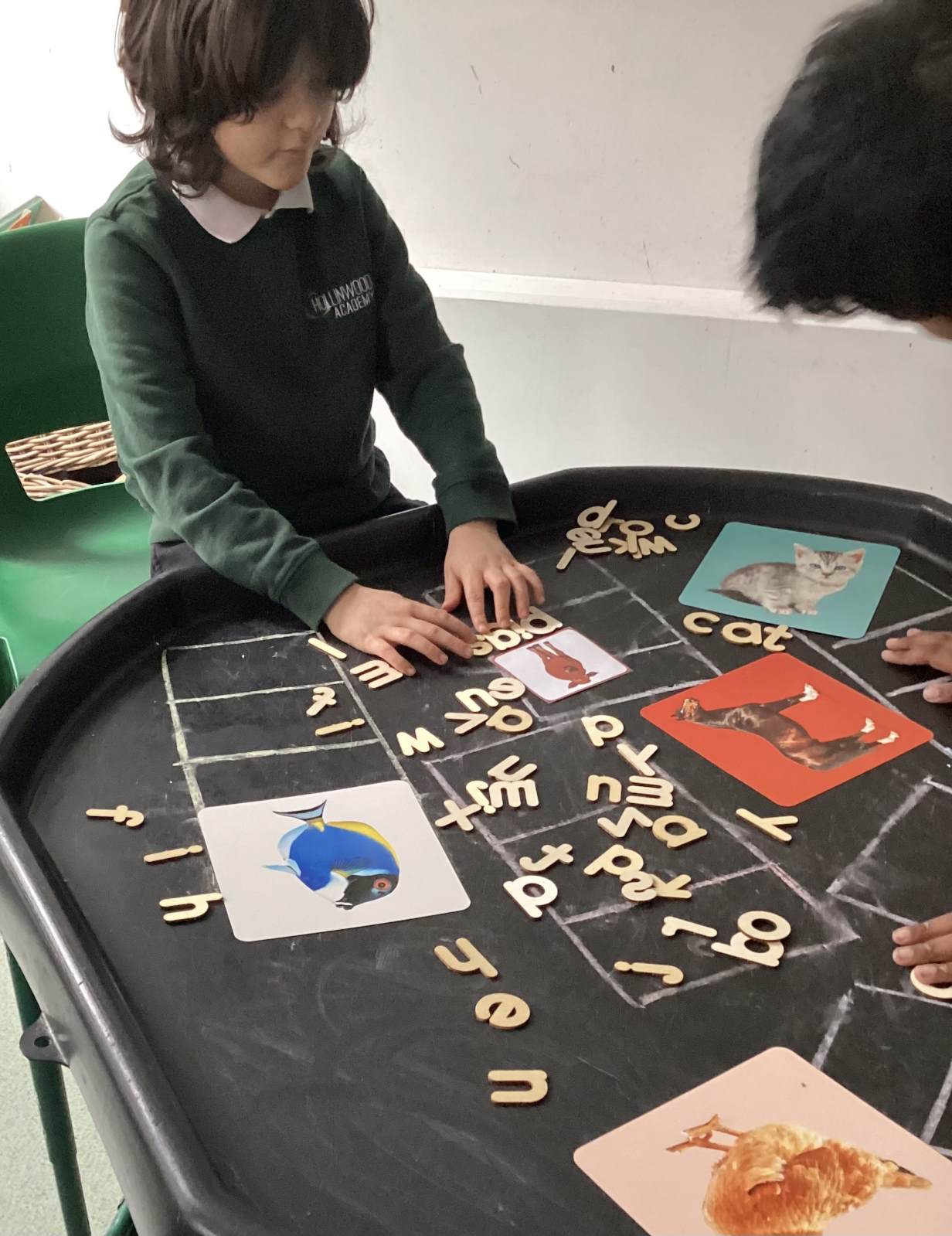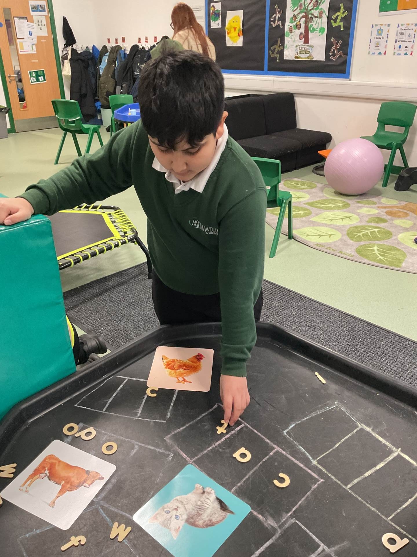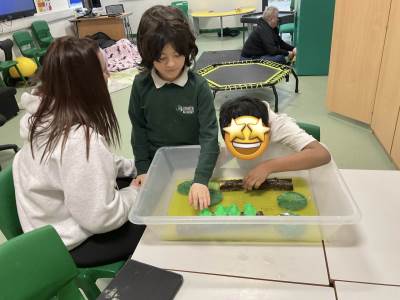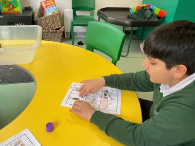 In our Curiosity, Cause and Effect lessons, we’ve been exploring a “5 Little Speckled Frogs” tray to practise counting and early maths skills. Using communication boards, the children shared how many frogs were left on the log. We’ve developed shared attention through playing Marble Run, worked on sharing resources with friends, and taken turns with a peer. Our sensory circuits have helped support our self-regulation, using equipment such as the yoga ball, trampoline, squeeze machine, and our cosy sensory den (a firm favourite). We also practised mark-making with bingo dabbers and paint and used wooden letters to spell the names of different animals.