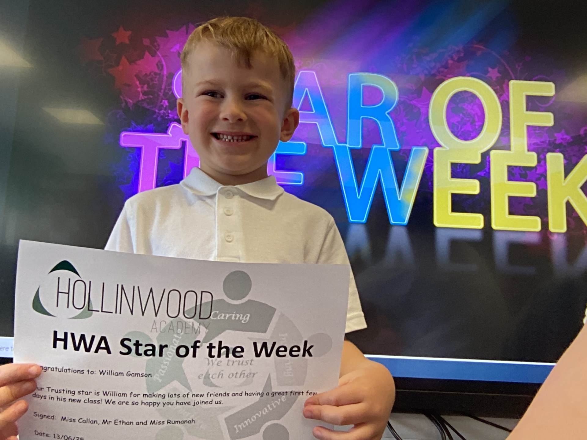 Miss Boothroyd’s HWA We are trusting goes to Louie for doing good listening and for helping his teachers.