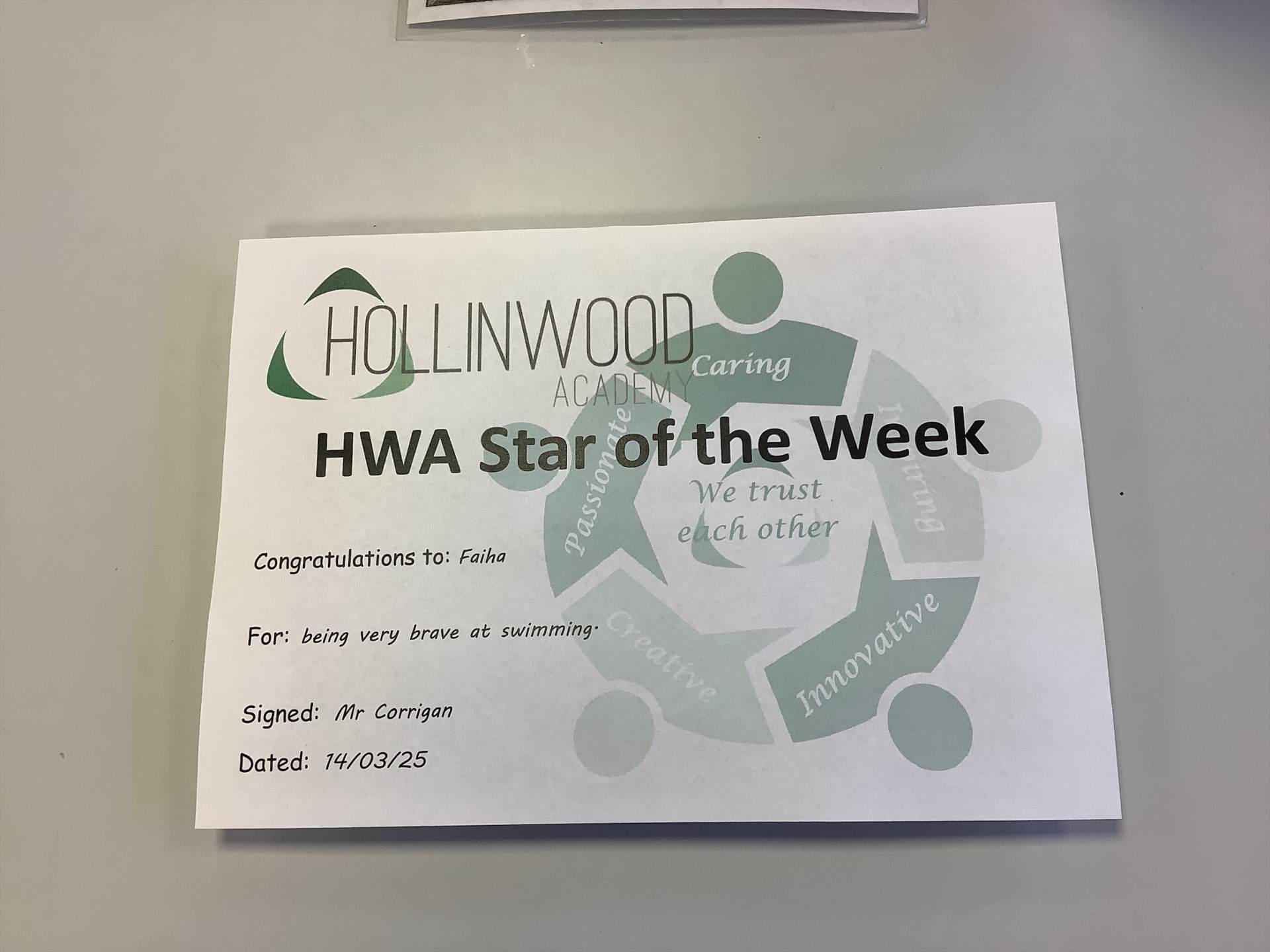 Mr Corrigan’s HWA We are Creative star is Faiha for: being very brave at swimming.