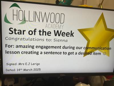 Mrs Lerigo’s STAR of the week is Sienna for: amazing engagement during our communication lesson creating a sentence to get a desired item.
