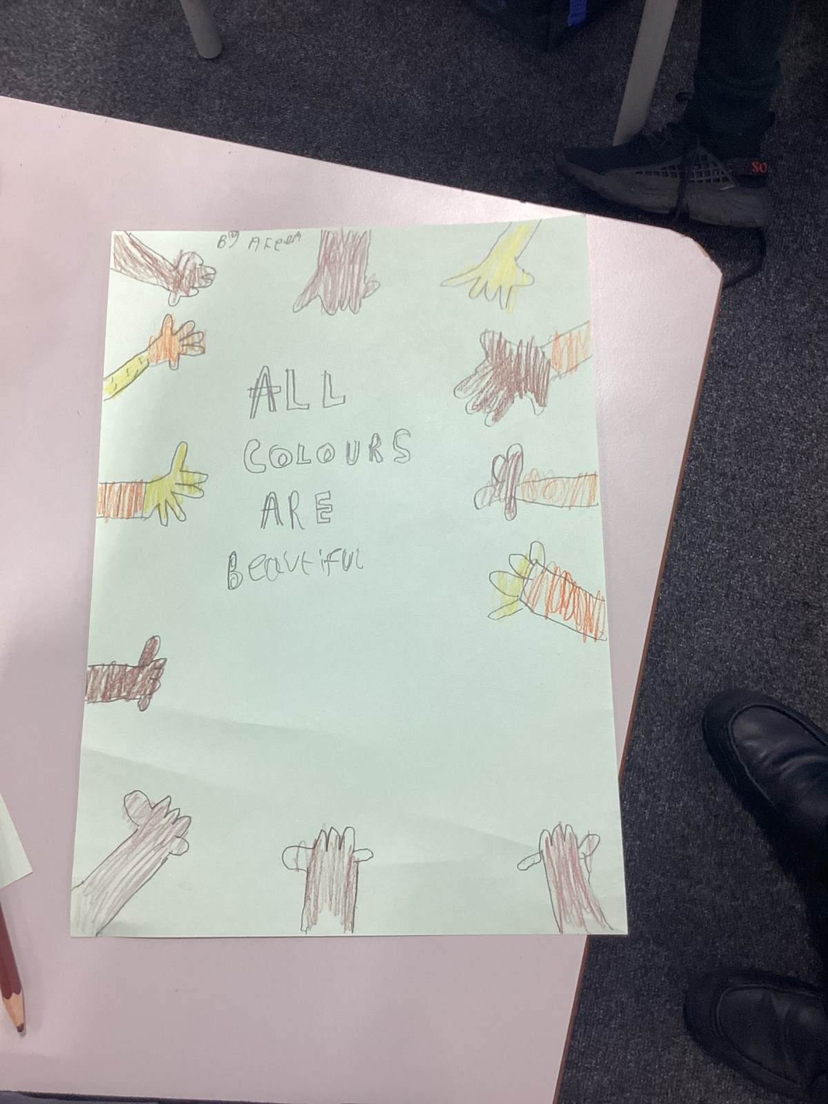 Akeem produced a beautiful poster. The poster states that: ‘all colours are beautiful’. We loved the poster so much we have given it pride of place on our form wall.
