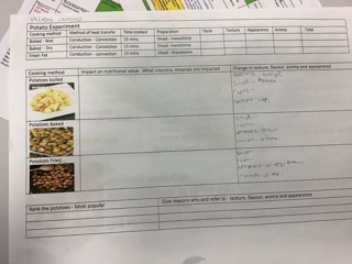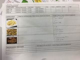 In Food Preparation and Nutrition, we have been investigating different cooking methods and looking at these methods through a sensory analysis. Alexis and the rest of the class have taste tested the different sensory attributes of potatoes when boiled, roasted, and baked. In addition to this we have made a range of different dishes using the hob.