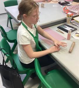 Miss Oakley’s HWA Creative STAR is Euan for making patterns using the dinosaur stamps.