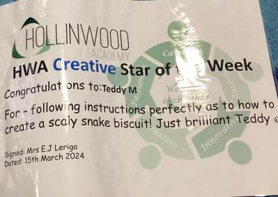 Mrs Lerigo’s HWA Creative STAR is Teddy M for following instructions perfectly as to how to create a scaly snake biscuit! Just brilliant