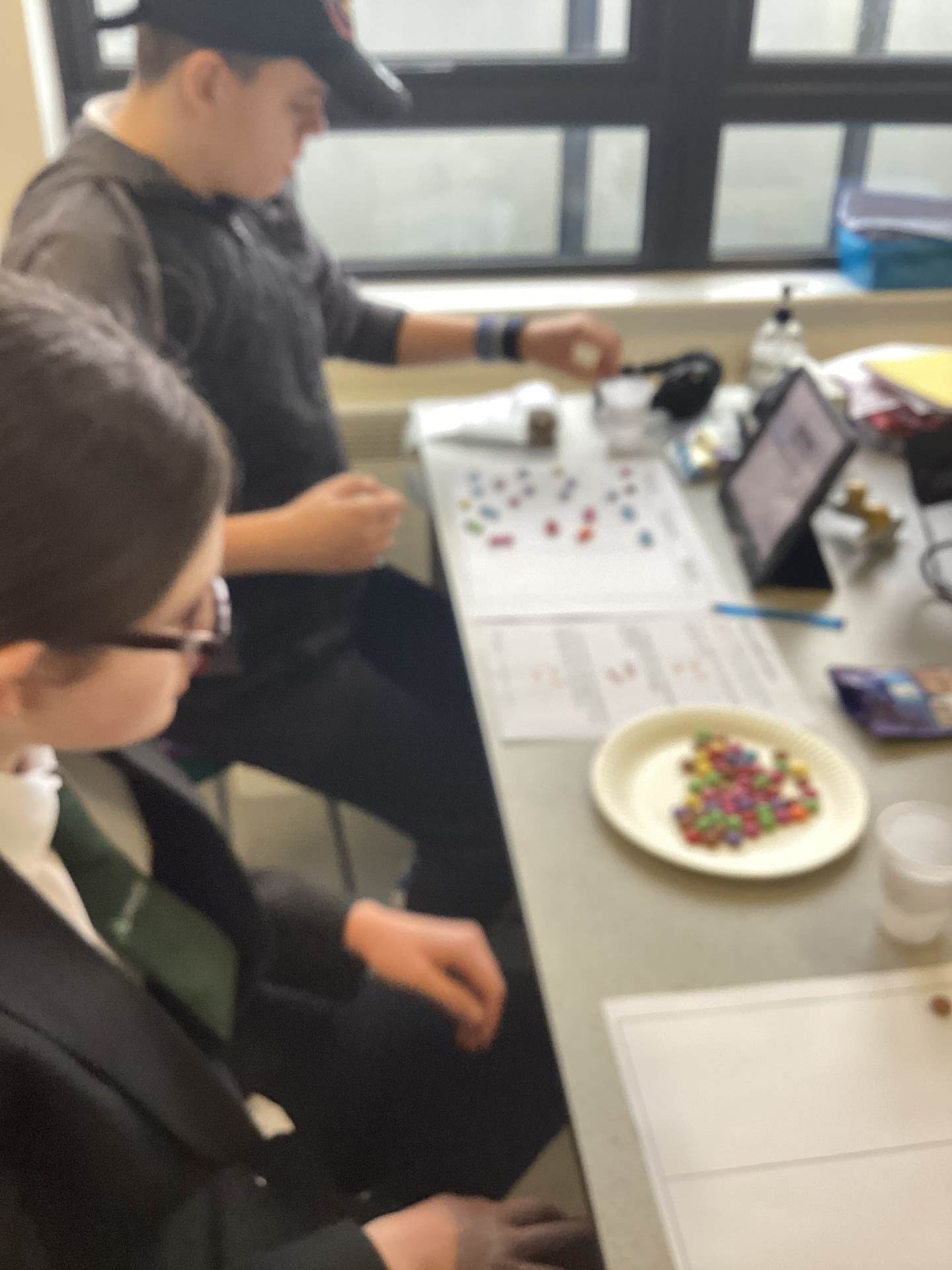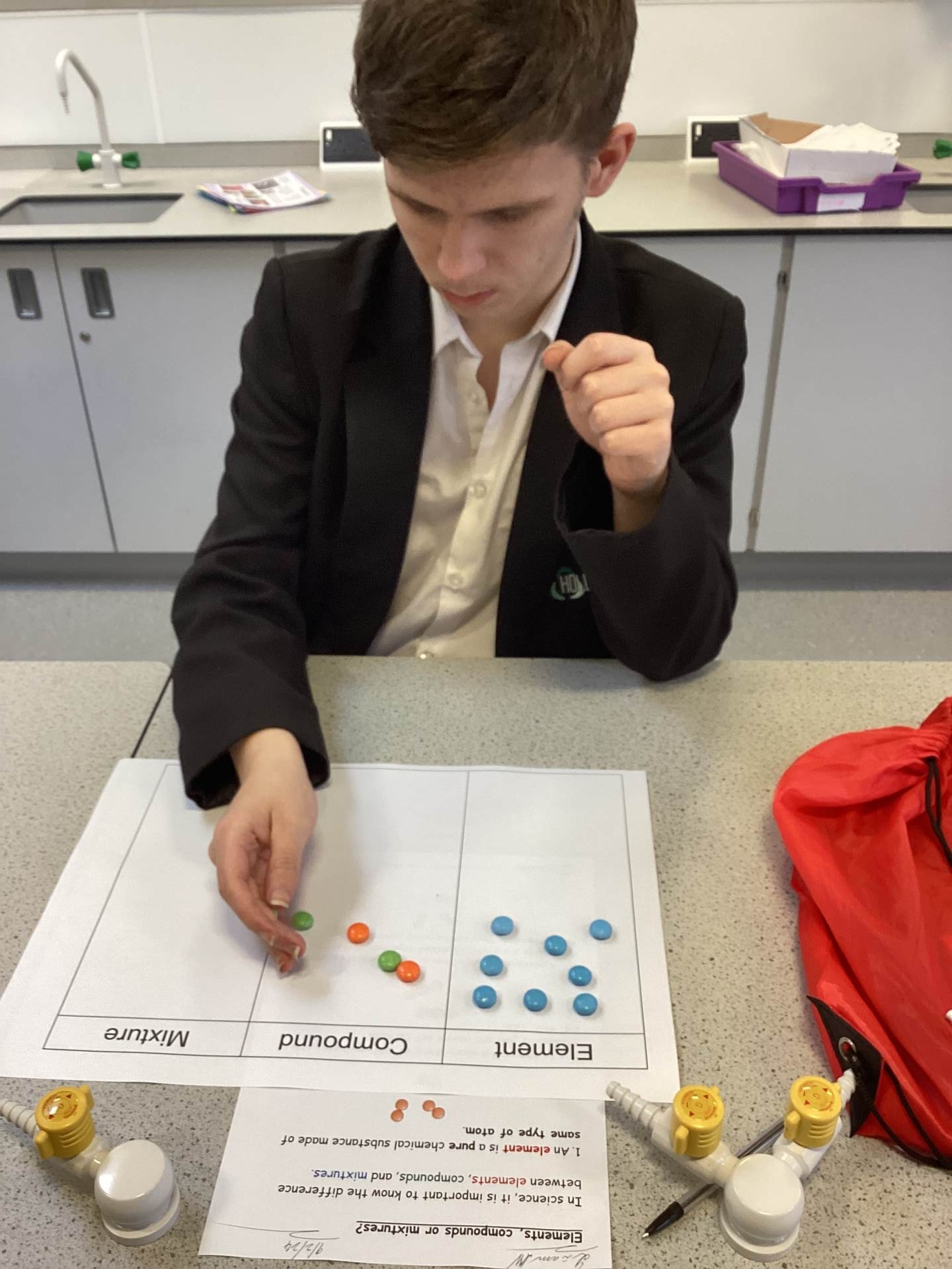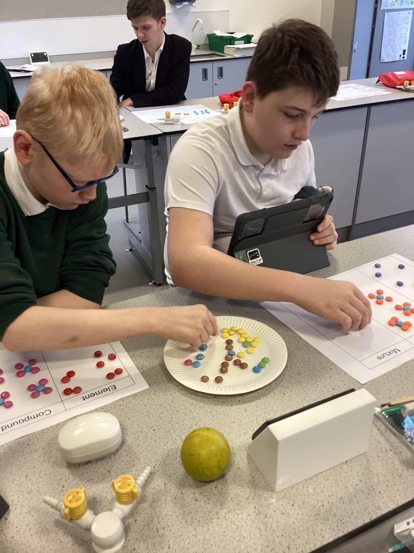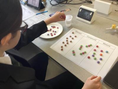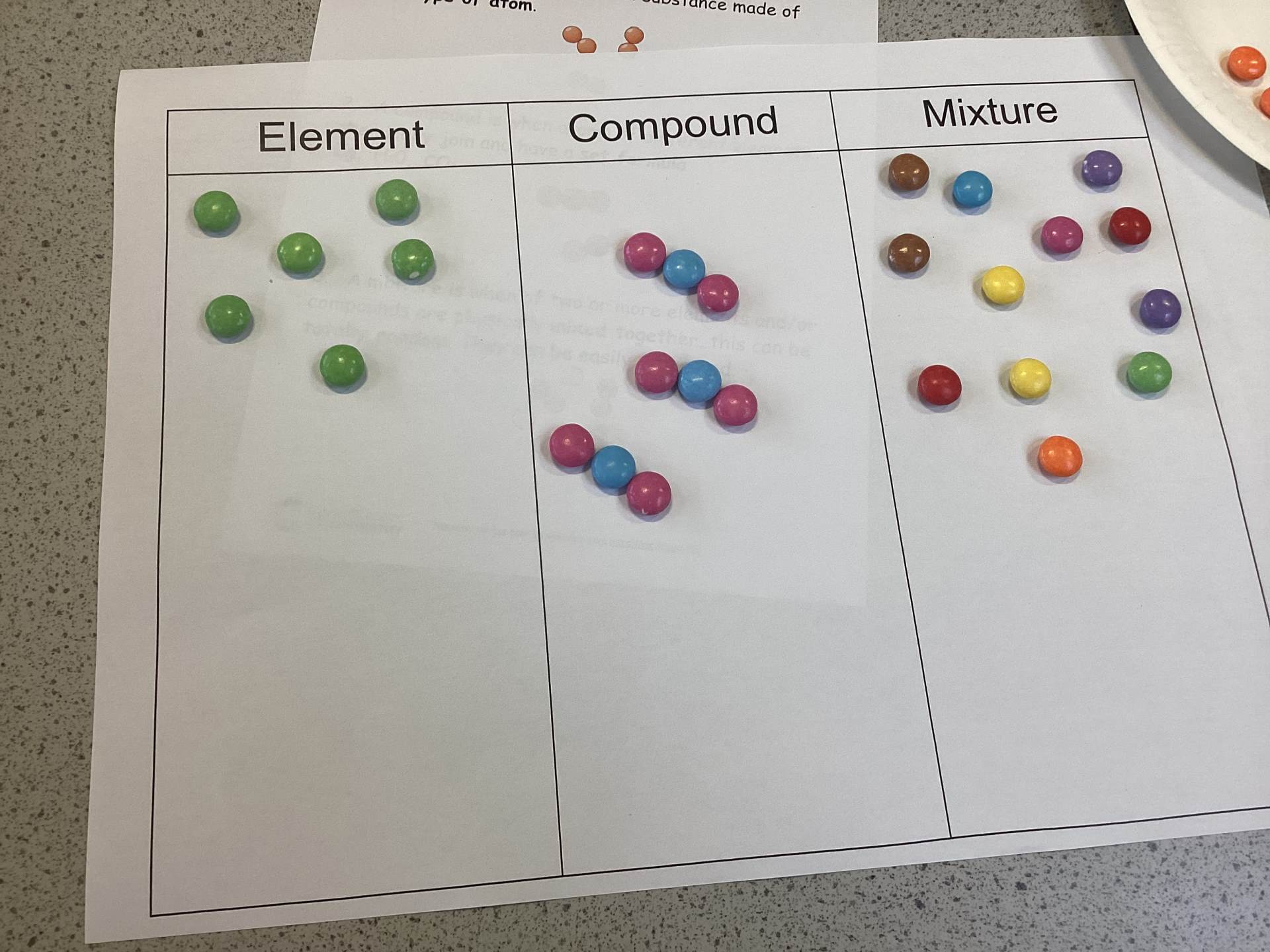 For the next science assignment, we were arranging smarties to be like the atoms of elements. We used one colour of smarties as pure elements, having two different coloured smarties, but joined together, as a compound, and two or more coloured smarties spread all around as a mixture. Our teachers were pleased with the way we were all working independently and commented to each other saying “they all did really well”.