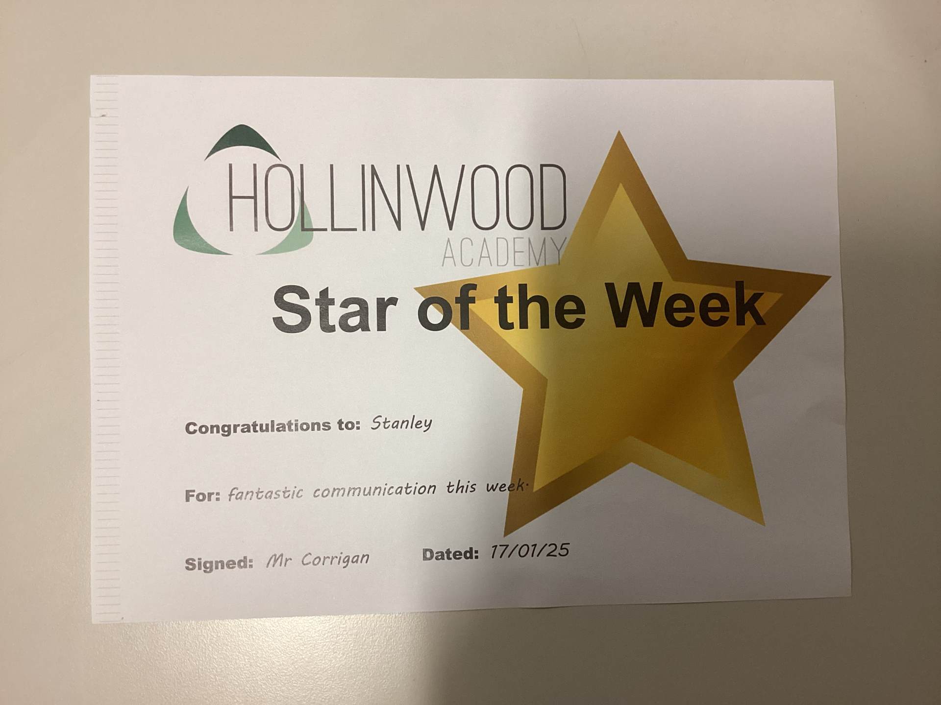 Mr Corrigan’s STAR of the week is Stanley for fantastic communication this week.