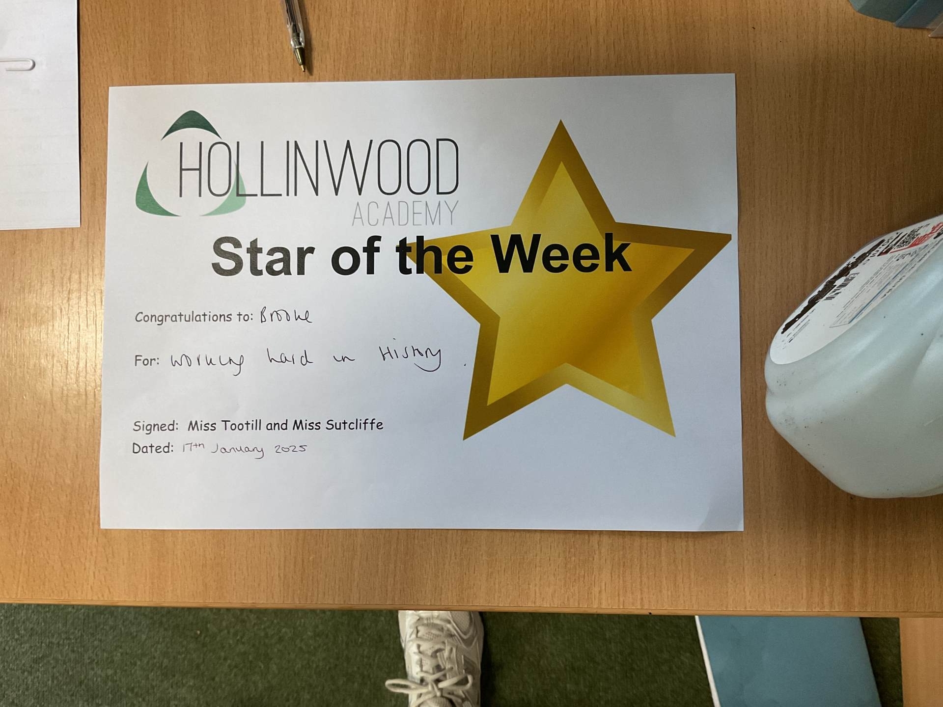 Miss Tootill’s STAR of the week is Brooke for having an excellent History lesson.