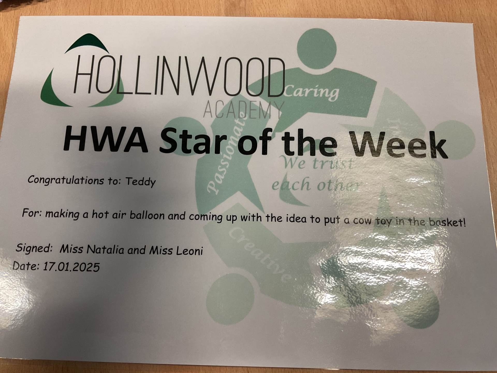Miss Pietraszewska’s HWA We are Innovative STAR is Teddy for making a hot air balloon and coming up with the idea to put a cow toy in the basket!
