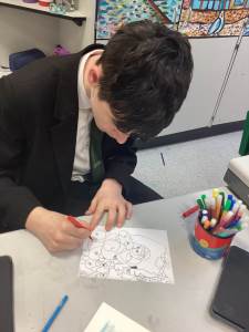 In Art students have been looking at the work of Jon Burgerman and have created their own wallpaper designs inspired by his work.