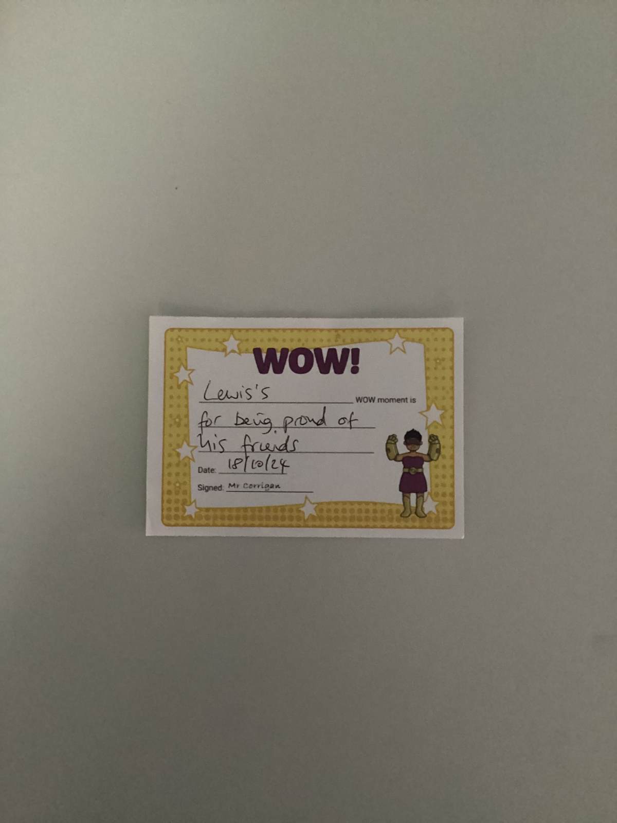 Mr Corrigan’s WOW moments go to Lewis for being proud of his friends.