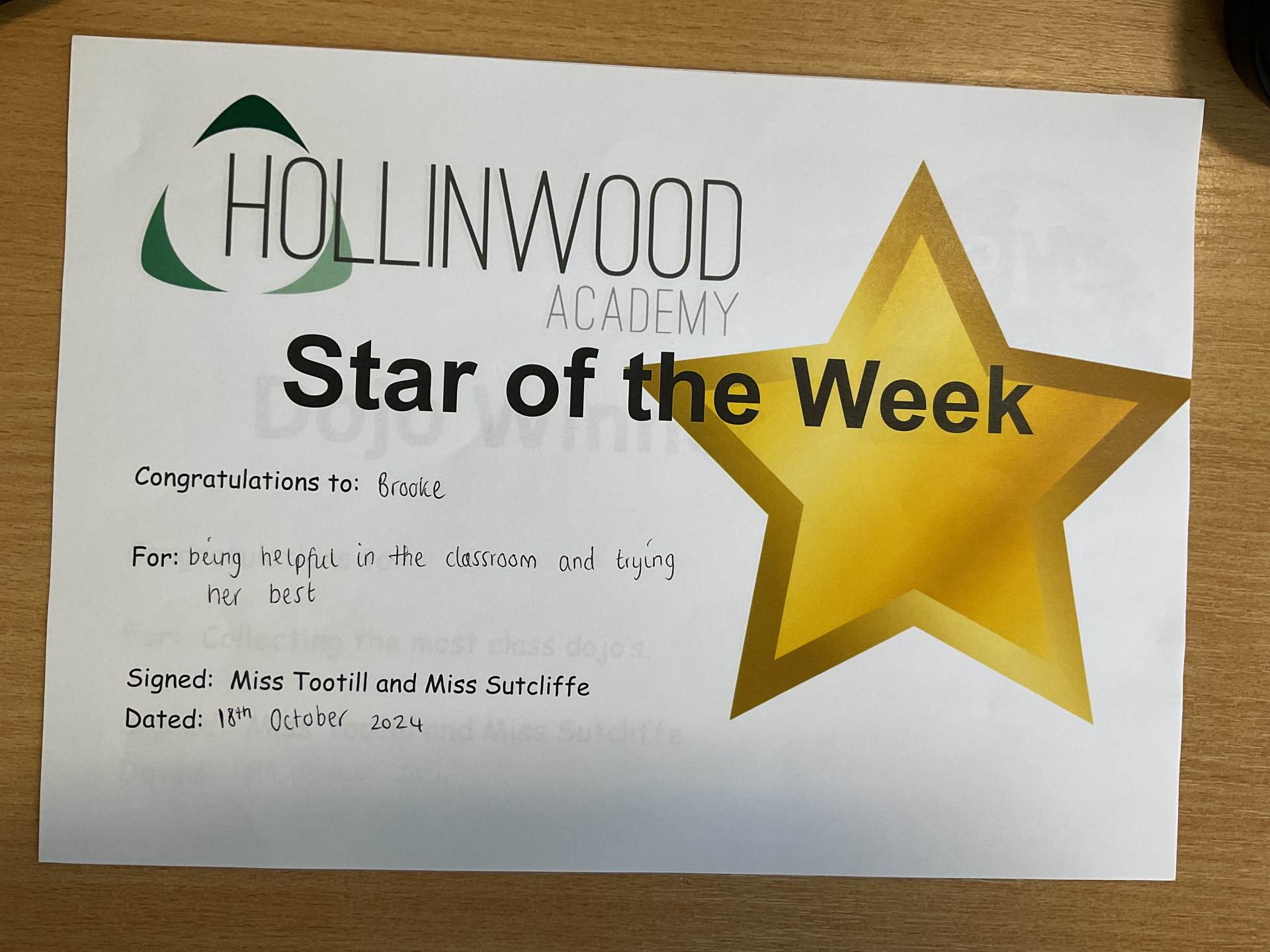Miss Tootill’s HWA We are Caring STAR is Brooke for being helpful in the classroom and trying her best.