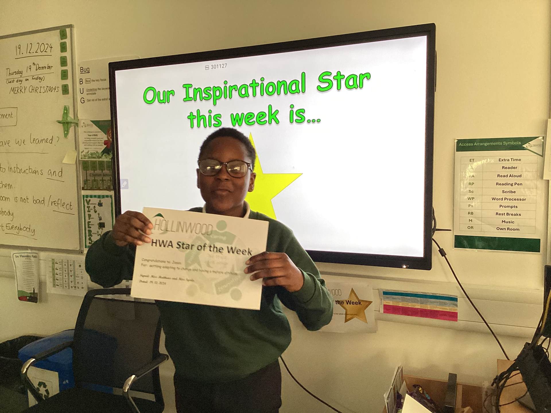 Miss Matthew’s HWA We are Inspiring STAR is David for his positive attitude to learning this week.