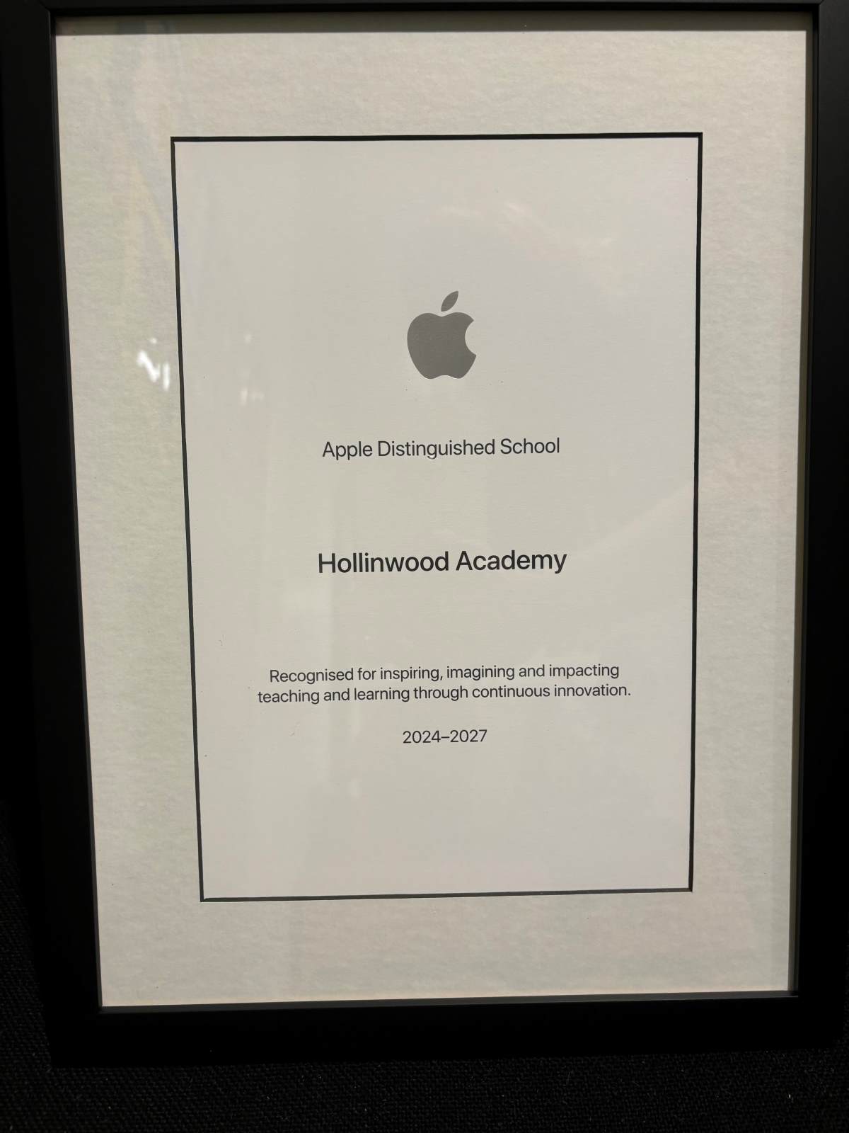 In September 2021, Hollinwood Academy was awarded the Apple Distinguished Status and during the summer term last academic year, I had to re-apply for the Status and we have been recognised, again, as an Apple Distinguished School for the 2024–2027 program term. I could not be prouder!! Hollinwood Academy has been recognised for innovation, leadership, and educational excellence using technology.