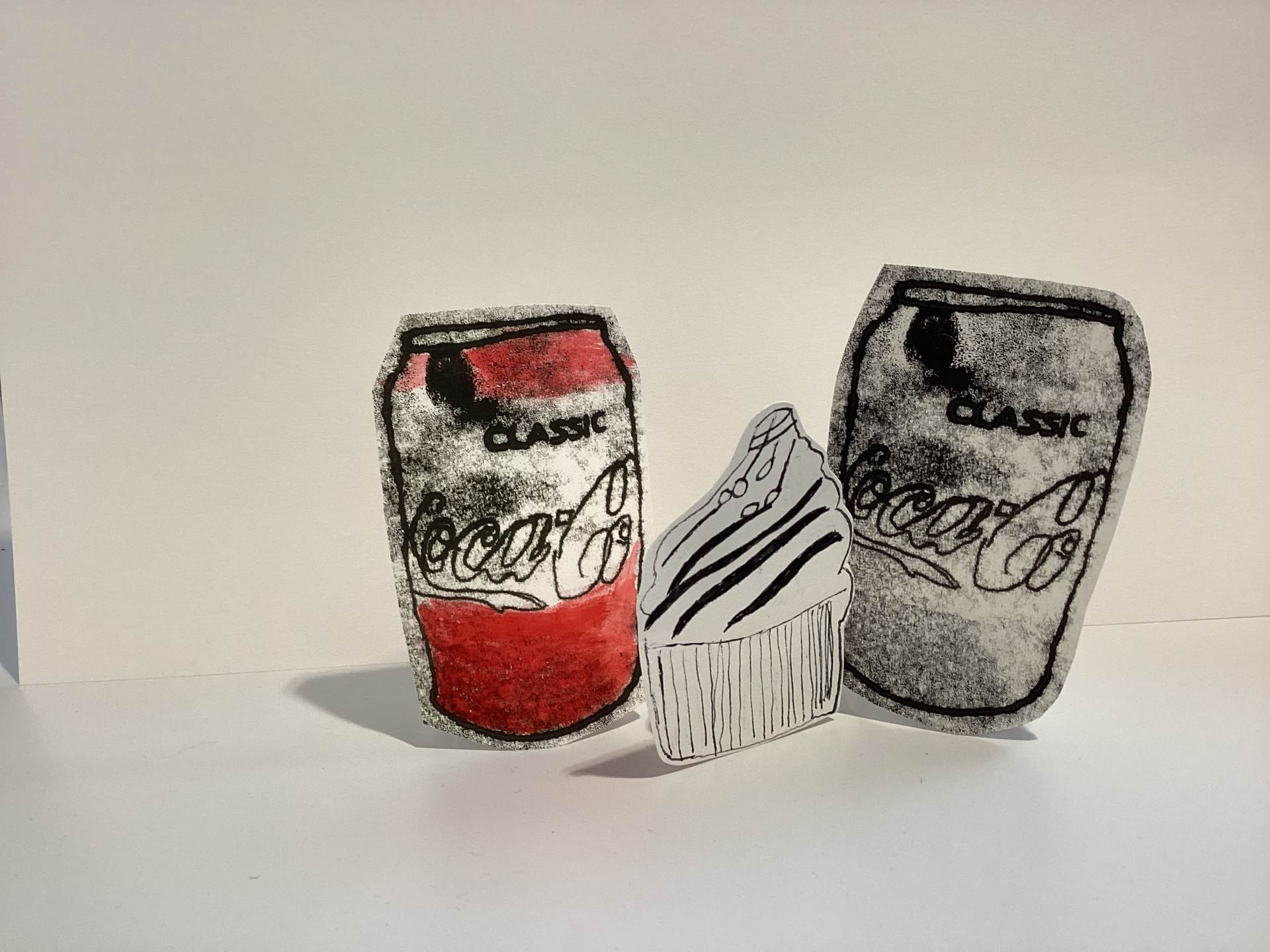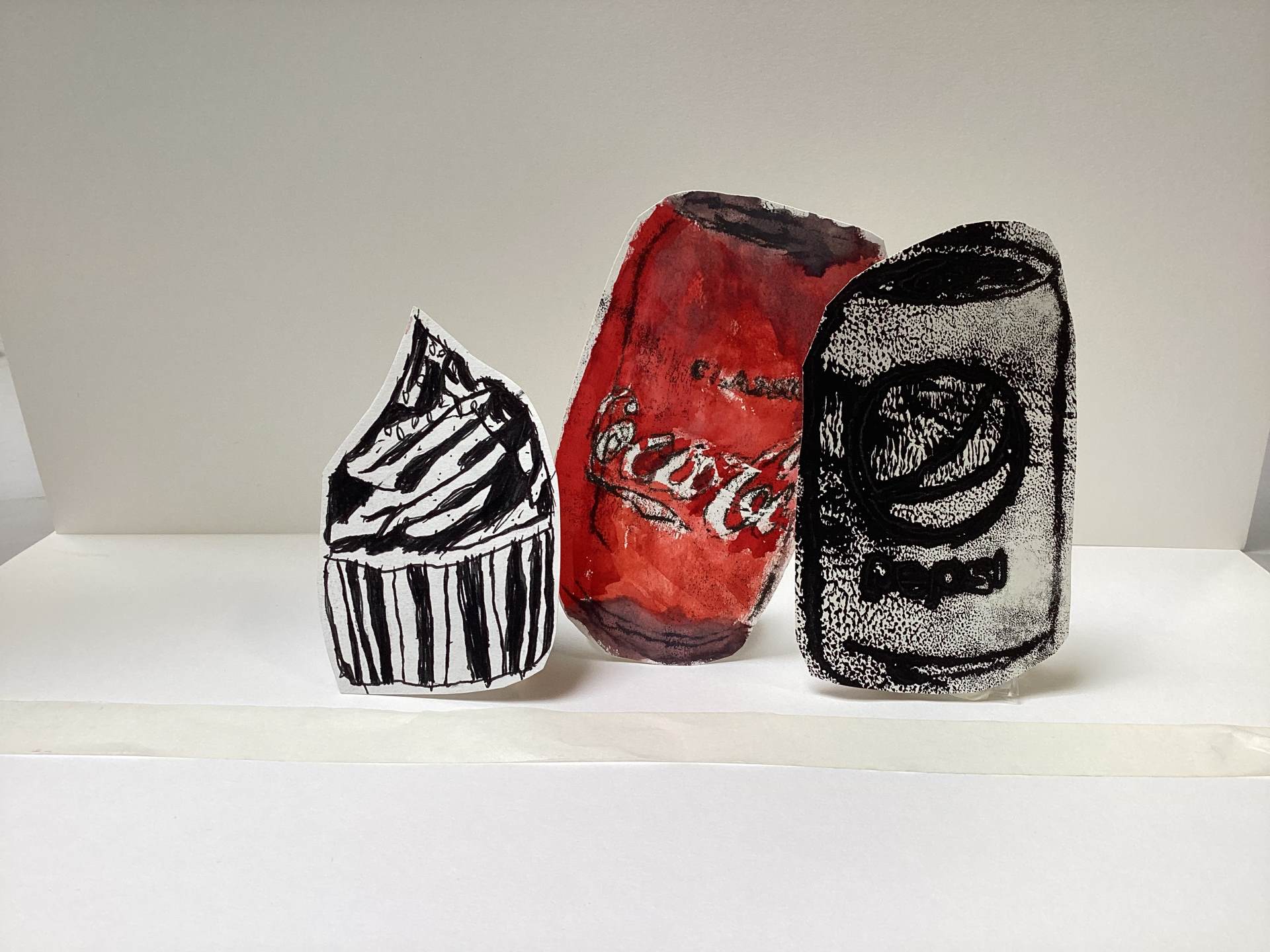 Over, the past term the class have been using a variety of techniques of printing and ink drawing in Art to create copies of drinks can and cupcakes. The final pieces based on work by Kate Bingaman-Burt look fantastic.
