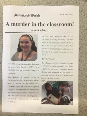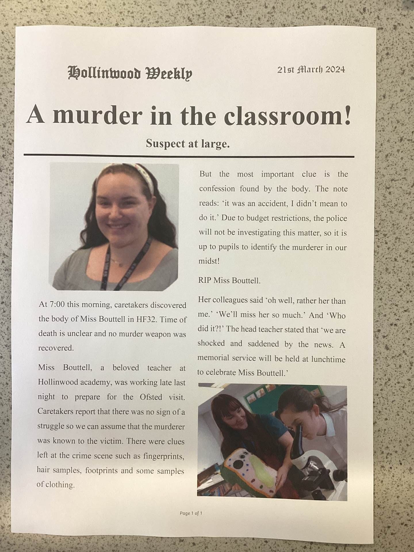 Across the secondary corridor there has been a scientific investigation taking place to investigate “Who done it?” …. The beloved Miss Bouttell was unfortunately murdered on 20.03.2024 and it was down to years 7, 8, 9, 10 & 11 to solve the crime and apprehend the murderer.