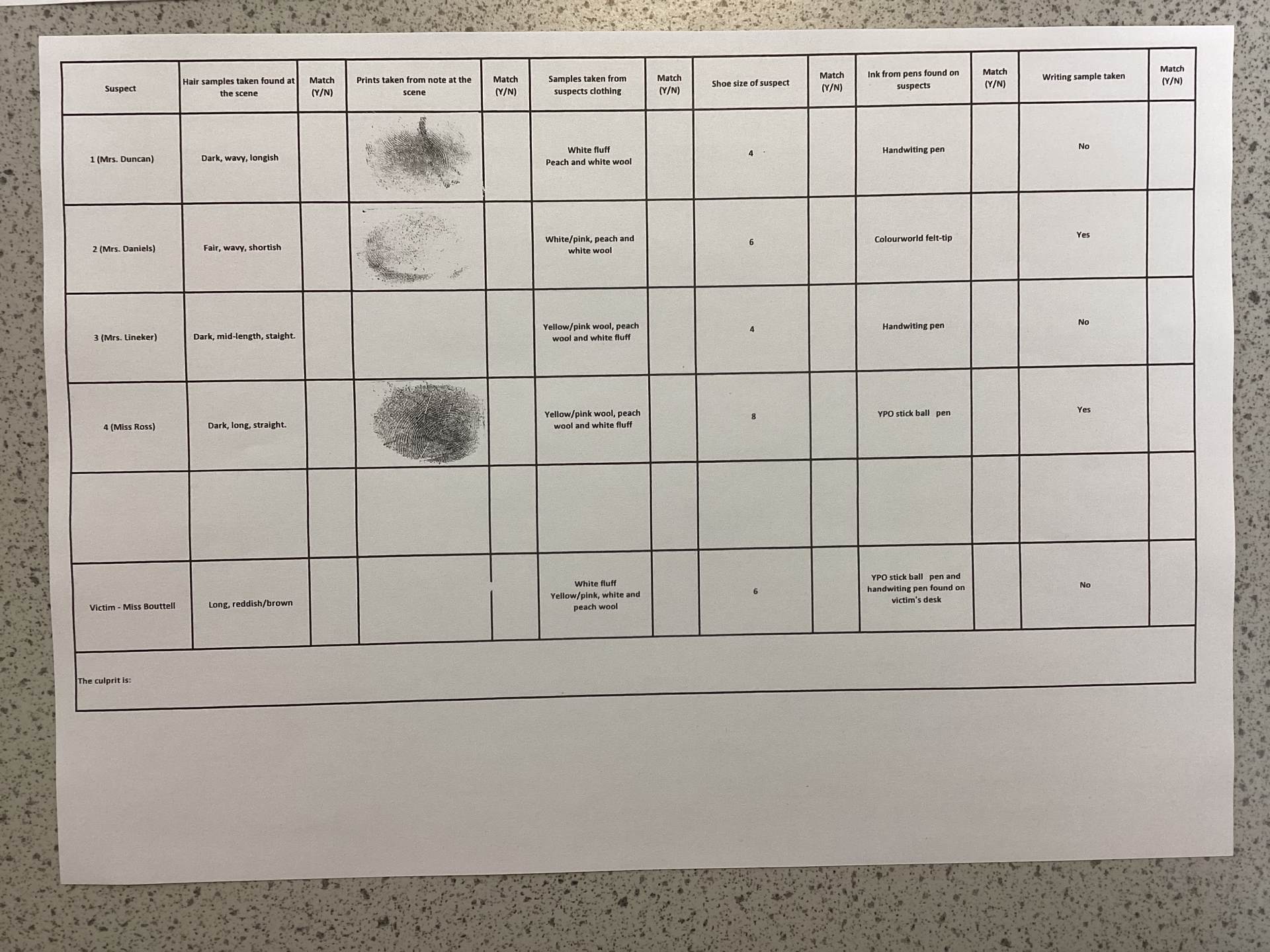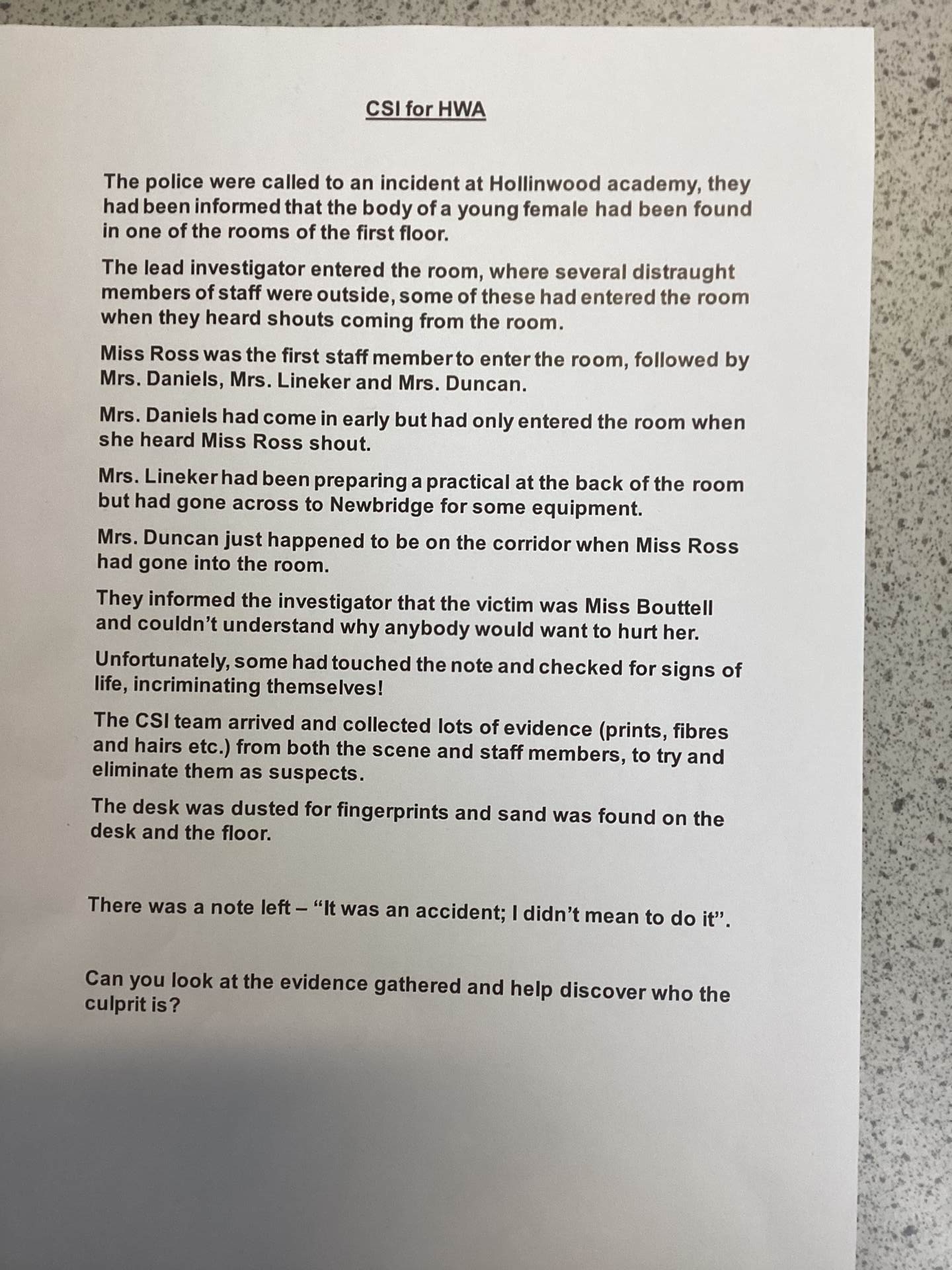 The students showed great teamwork, good communication skills and most importantly had fun working together. Well done to everyone who took part, especially those who solved the case. A big thank you to Mrs Daniels, Mrs Duncan & Miss Ross for being suspects and our lovely victim Miss Bouttell. But the credit for such a wonderful investigation goes to Mrs Linekar, who spent days creating the activity, differentiating it for each year group, and most importantly being the MURDERER.