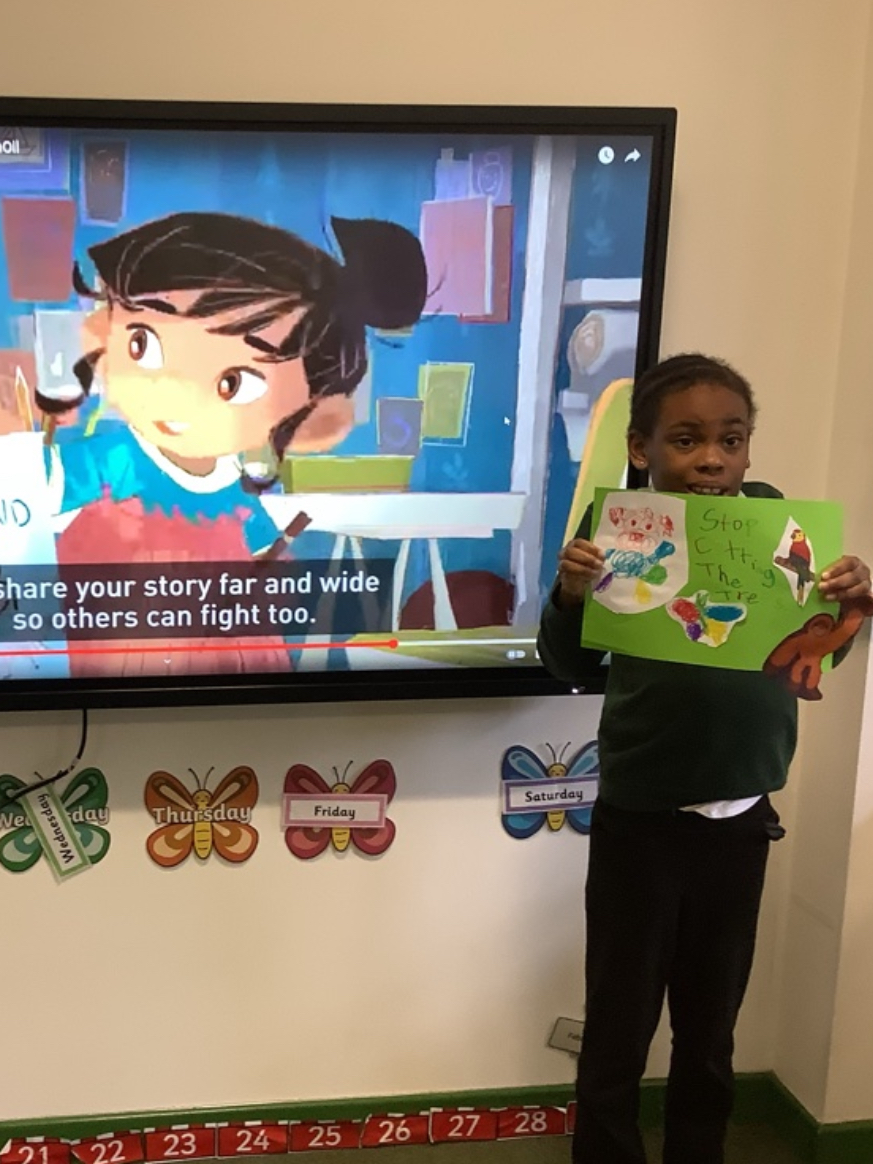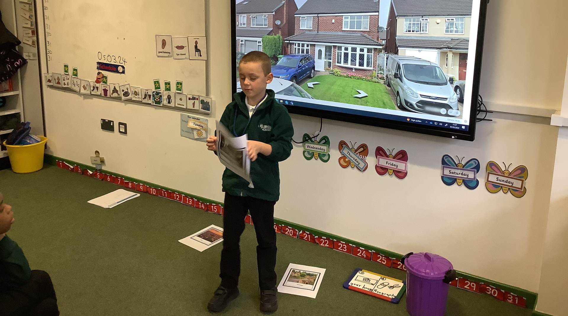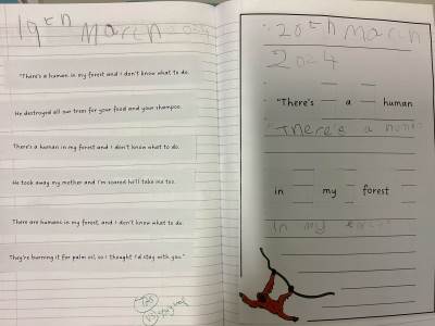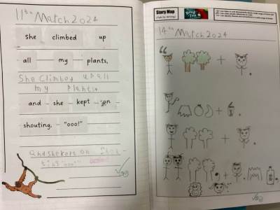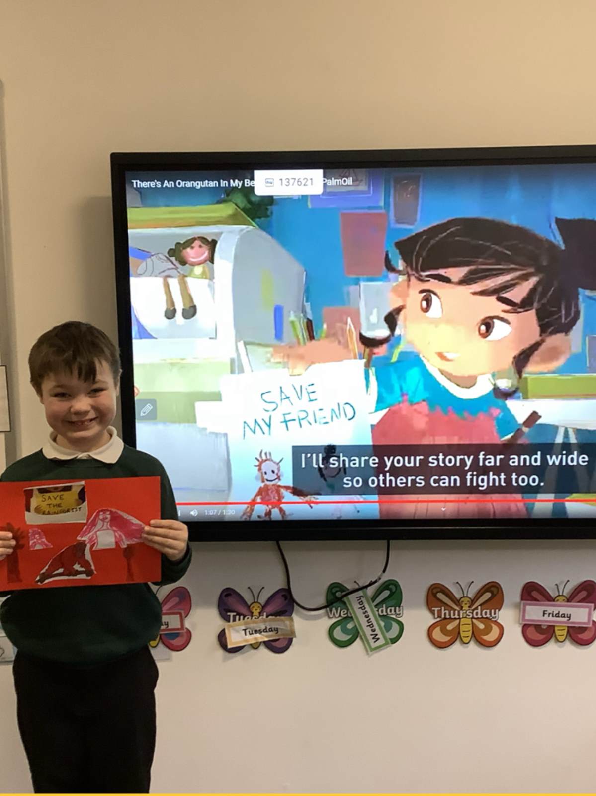 "Our chosen literacy book this half term is, "There's a Rang-tan in my Bedroom". This story addresses important environmental and conservation themes and the children have really enjoyed the topic. Using the Talk for Writing approach, our key focus has been retelling and innovating the story through actions, story maps and writing. On World Book Day the class proudly shared their own favourite books from home and school."