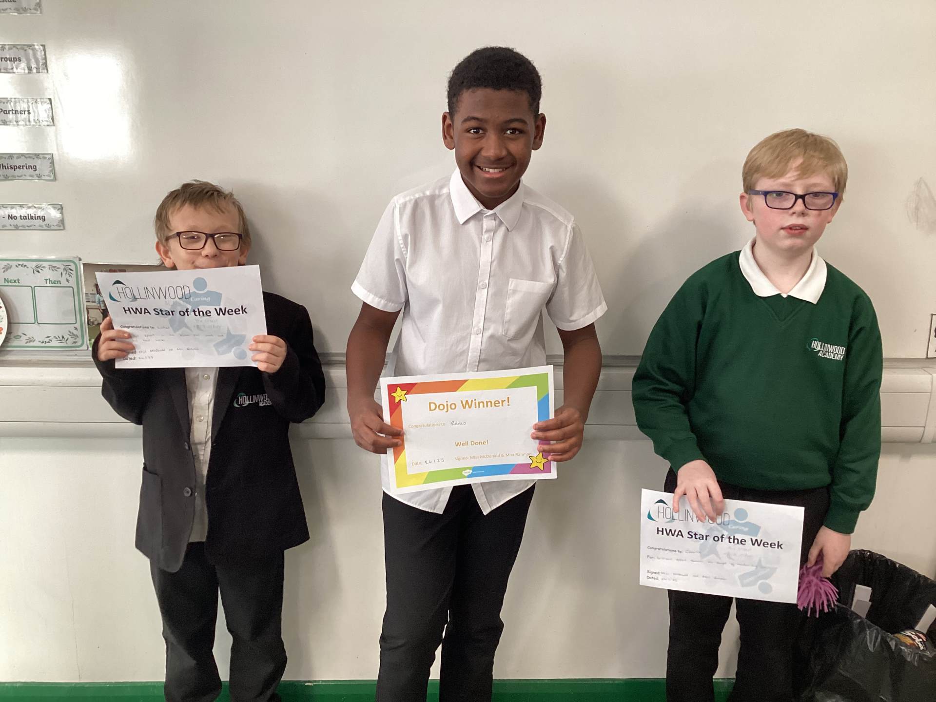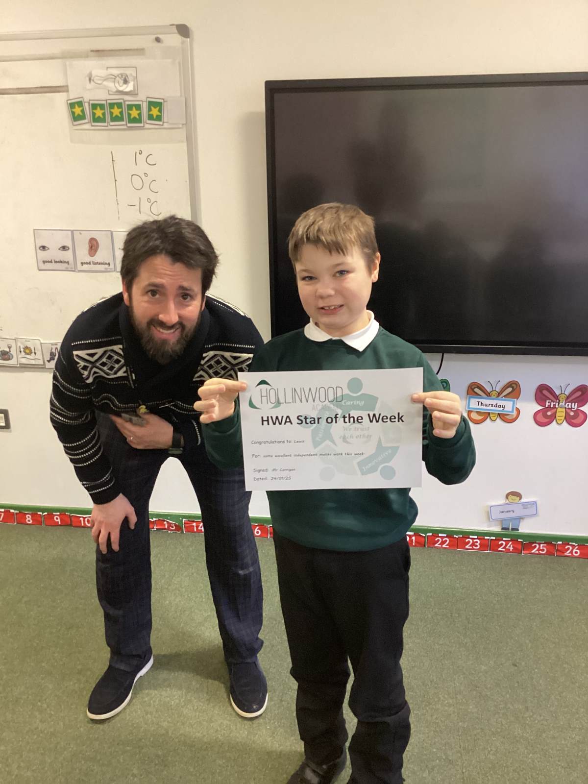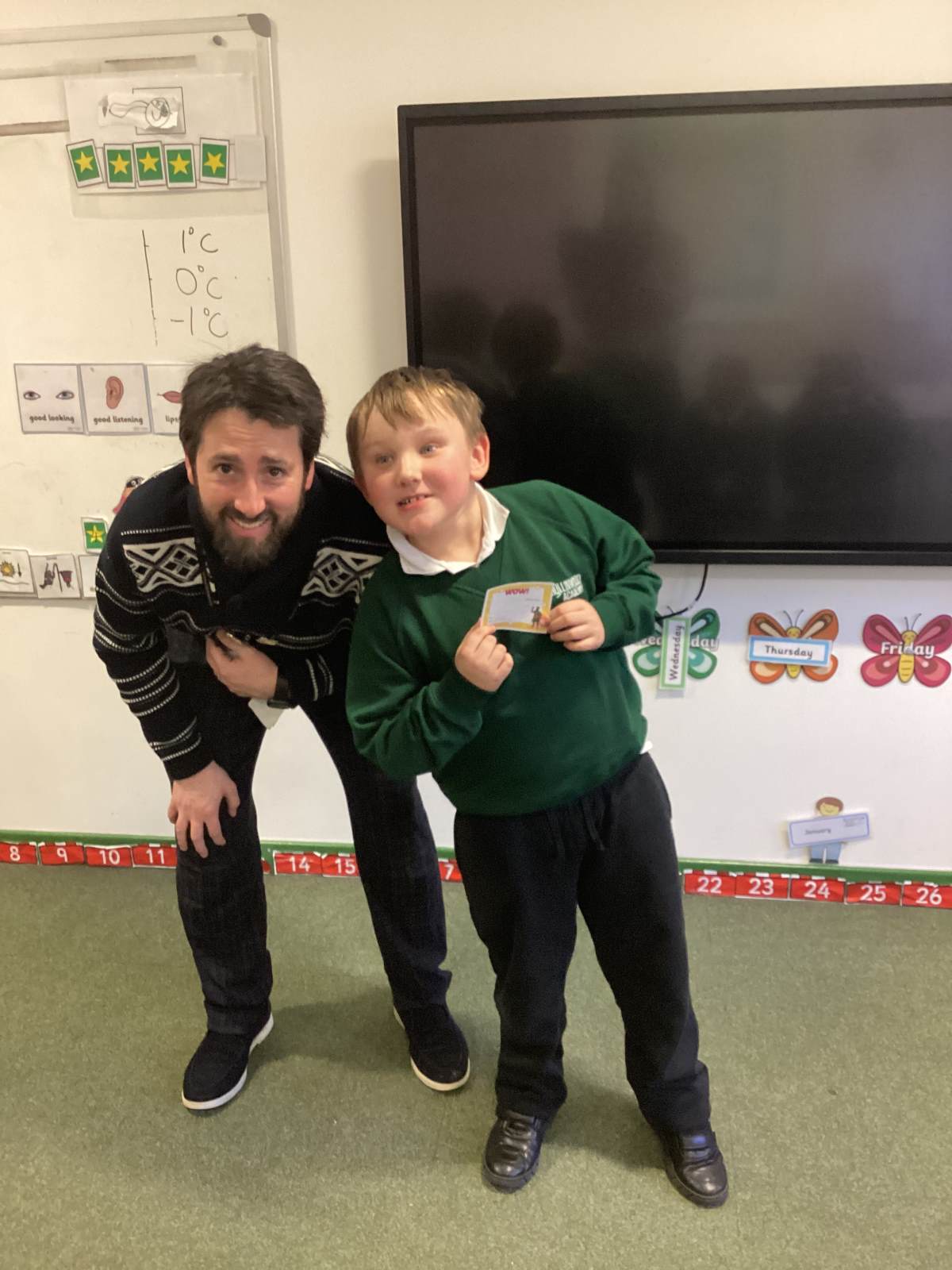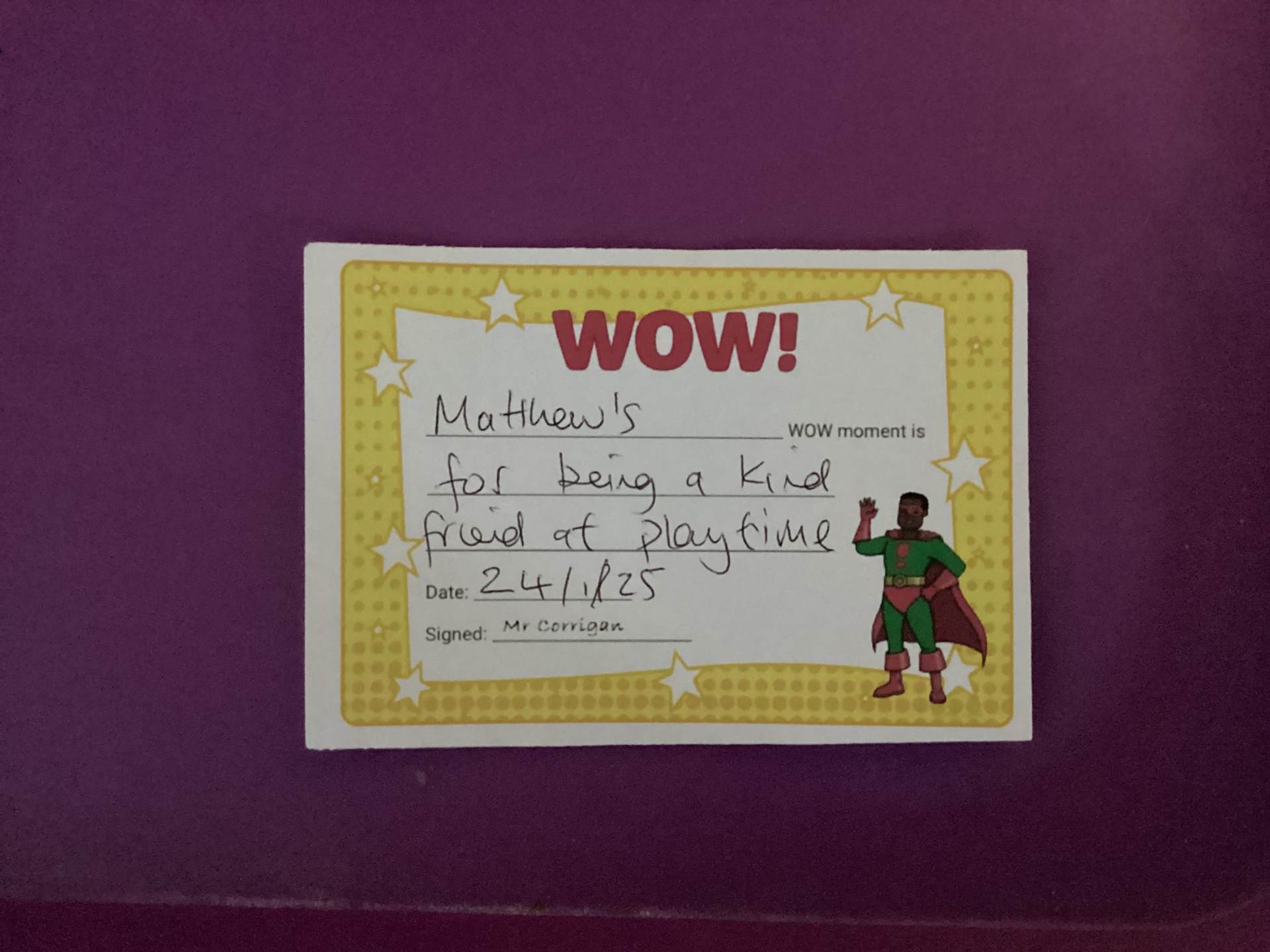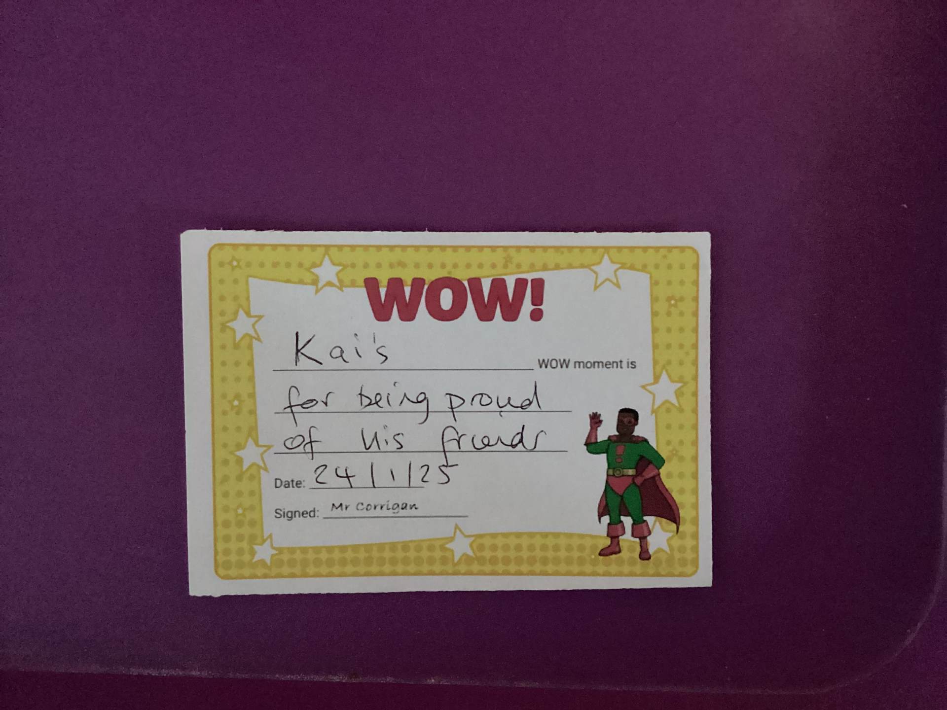 Mr Corrigan’s WOW moments go to Matthew for being a kind friend in the playground & Kai for being proud of his friends for getting SOW
