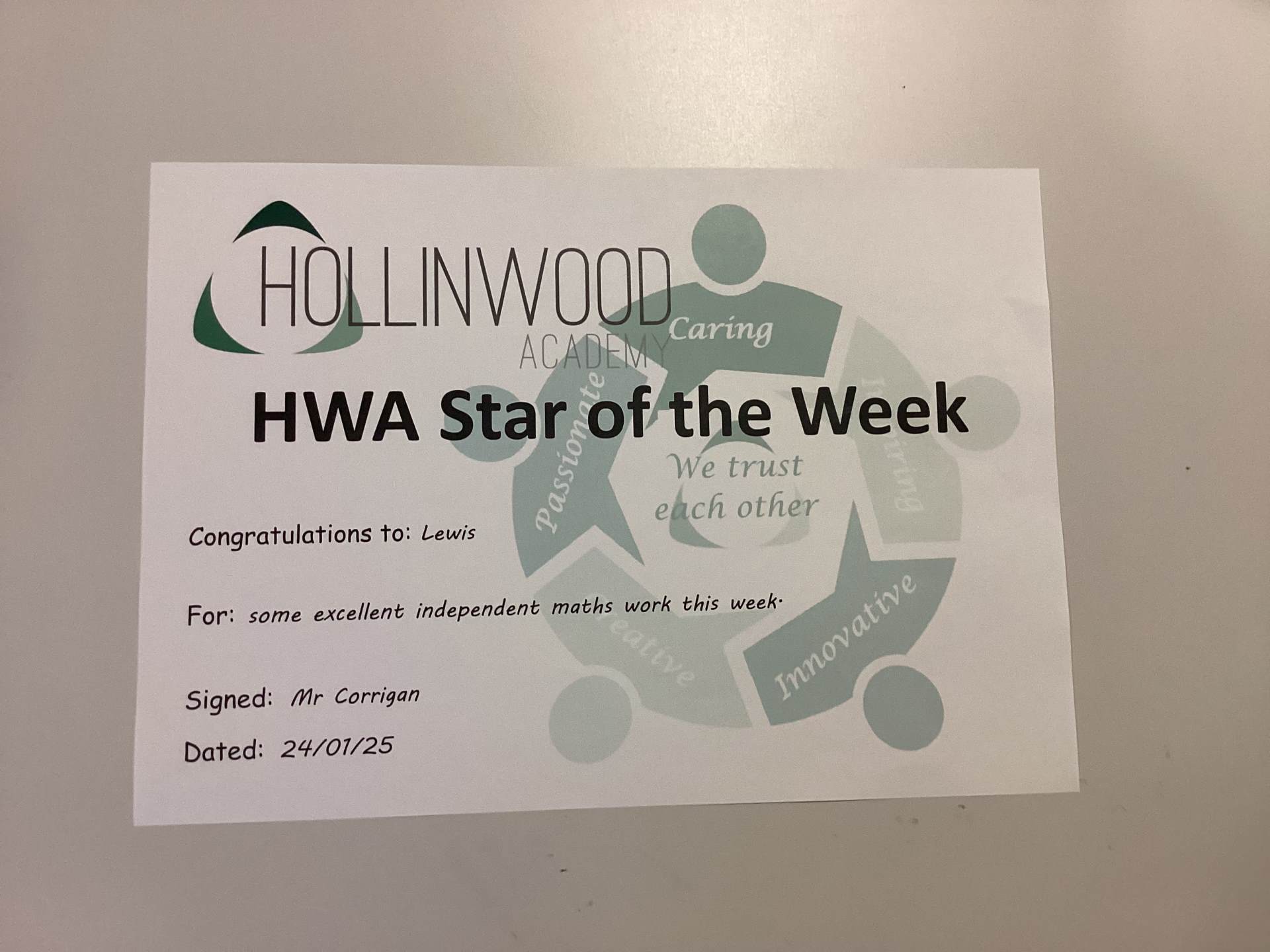 Mr Corrigan’s HWA We are Innovative star is Lewis for some excellent maths work this week.