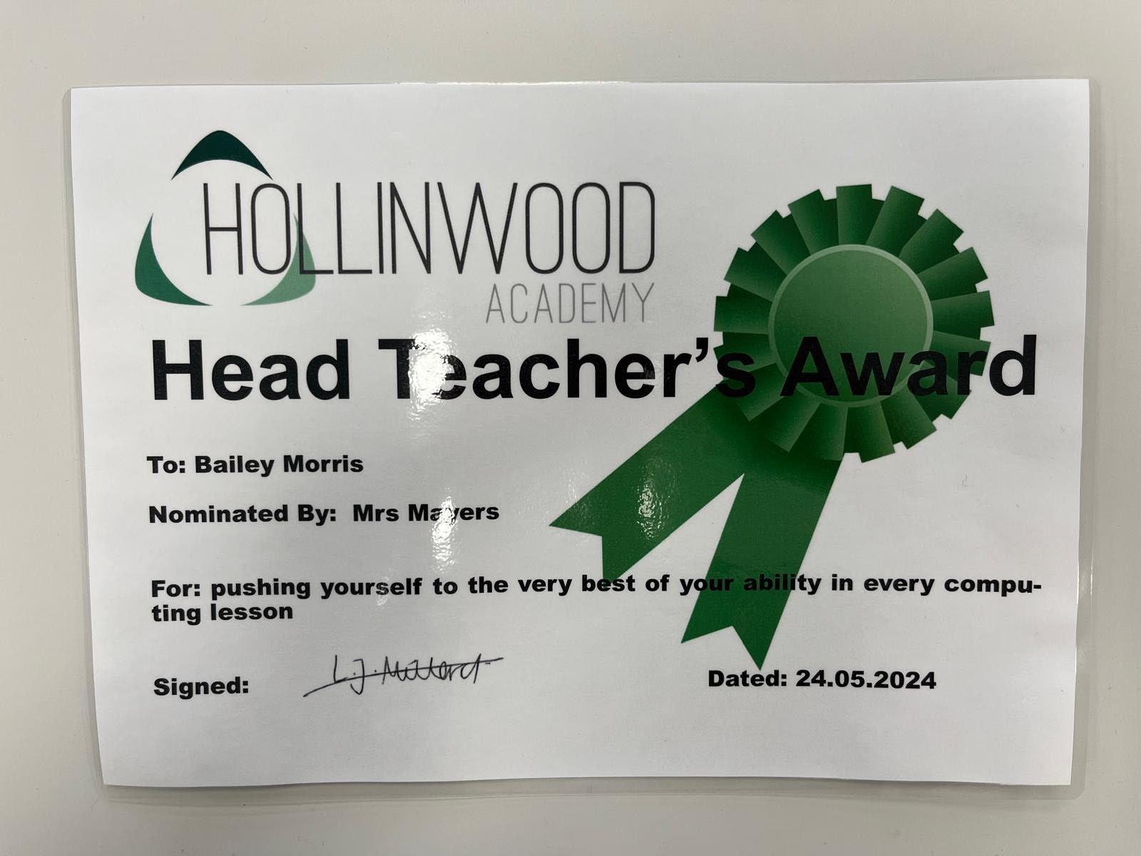 Thank you, Mr. Page, Miss Nuttall, Miss Wallace, Miss Smith, Miss Gold, Miss Gibson, Mr. Valentine, Miss Bones and Mr. Gold for being amazingly supportive of my progress up to today. Now getting ready to do my GCSE’s, I will be eternally grateful.
