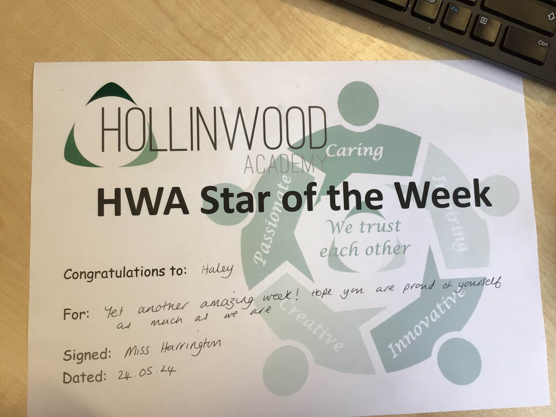 Miss Hulme’s HWA Passionate STAR is Derry for being very resilient in our lesson and completing a fantastic piece of English work independently.