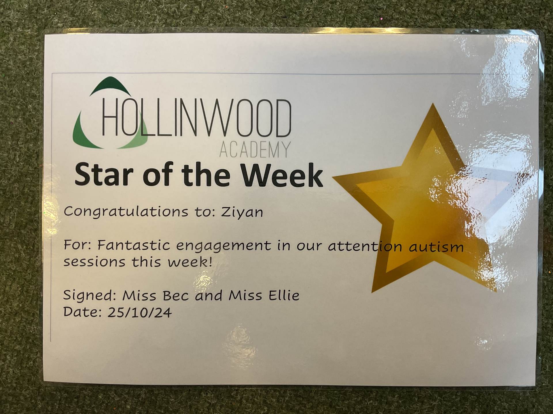 Miss Bailey’s STAR of the week is Ziyan for fantastic engagement in our attention autism sessions this week!