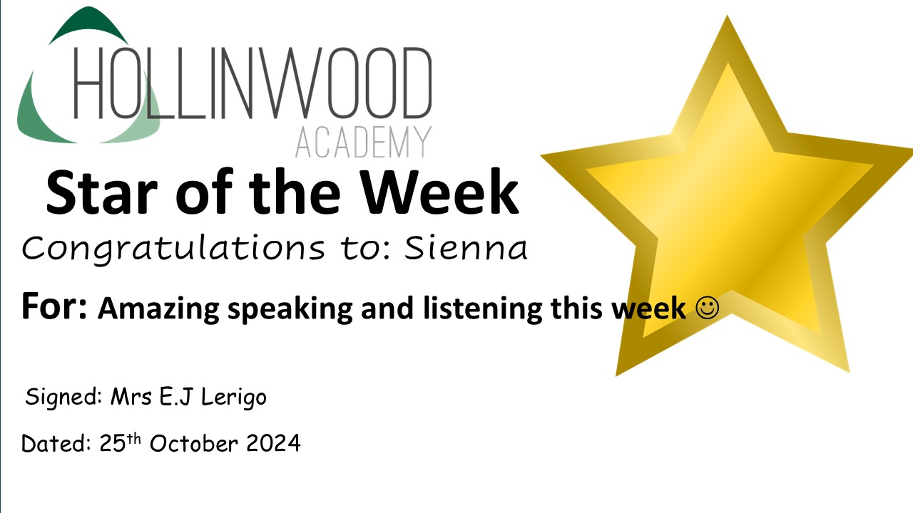 Mrs Lerigo’s STAR of the week is Sienna for amazing speaking and listening this week.