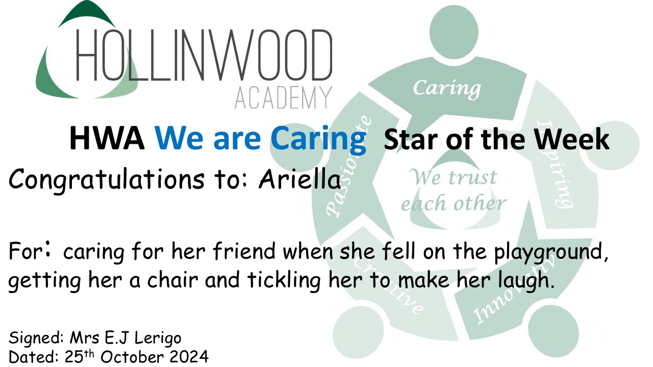 Miss Gittins’ HWA We are Caring STAR is Caitlin is our star of the week for accepting adult help this week when feeling frustrated.
