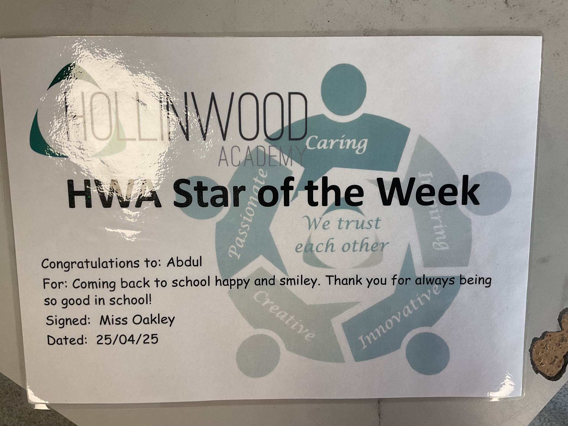 Miss Oakley’s HWA We are Passionate STAR is Abdul for coming back to school happy and smiley. Thank you for always being so good in school!